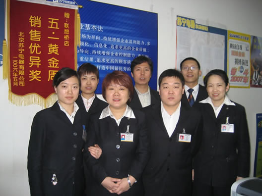 2008年,联想桥店员工在门口合影。 当然,除了把握机会,更要真正为顾客着想和服务,才能与顾客达成良好的关系。一次,因为车辆安排等原因,延误了送货,顾客很生气,师店长亲自上门给顾客道歉,安排安装等事宜,顾客感动,后来这位顾客的亲戚、朋友、同事都被介绍到了联想桥店,成为店面的忠实顾客。这样的例子很多,师店长有真诚的亲和力,与学校、公司、政府部门等都保持了非常好的关系。“我一直强调,宁可店面损失一点,也要让顾客满意。” 因为紧邻中关村,在很多人眼里,中关村的电子市场已经满足了电脑的购买需求,但师晓雯觉得,联想桥店未尝不可分一杯羹,况且,中关村的市场相对“混乱”,而苏宁可以提供更规范的服务。于是,2007年,在公司的支持下,她开始加大电脑等3C品类的出样,并紧密开拓海淀区的学生市场,到2009年,在联想桥店购买电脑的学生已经越来越多。 之前,联想桥店也一直在做夜市活动。但2008年,师晓雯想,是不是可以针对员工和员工家属做一次?于是,有了“员工回馈夜”,任何商品都打八折,结果意外火爆。 2009年,国家全面推行家电下乡和以旧换新,师晓雯亦积极响应国家政策和公司号召。“那时候虽然遭遇经济危机,但我们没感觉销售难做,还是在增长。” 2010年,师晓雯率先推进公司号召的店面精细化管理,通过关注销售过程中的每一个细节,提升顾客的满意度。像超市一样,关注进店数、客单价、成交率等,“比如有十个人进店,但都没有成交,就要分析具体的原因,想一想有没有留下他们的联系方式,他们为什么不买,等等。” 她进一步解释精细化管理的具体做法:“根据设定的目标和时间节点,看哪个部门、哪个品类、哪个品牌销售低,然后跟进和了解问题所在。比如,是不是因为到了午饭时间,店里顾客多,但没有人盯位、也没有人补岗。倘若如此,就要采取调整措施,解决这个问题。” “我给员工培训时一直强调,要把进店的每一个顾客都当作这一天的最后一个顾客,必须抓住这一单。事实上,机会无处不在,多说一句‘下次买东西到苏宁来’,可能无形中就多了一位顾客。” 销售的变迁 2010年年底至今,师晓雯力推公司倡导的销售四步曲和明码实价,并围绕自主产品进行培训,以及加深精细化管理。销售四步曲包括:发掘顾客需求;介绍商品功能;增强顾客购买信心;注意关联商品销售,做好售后服务。 “销售四步曲的执行,打破了以往凭感觉做销售的局面,按照流程和标准,一项一项完成接待工作,不会错漏任何一个环节,可提升工作效率和顾客满意度。尤其是片区今年新开的店面,先到联想桥店进行带教,用将近两个星期的时间,对接待顾客、查找库存、退换货等进行讲解,并设置模拟场景培训,最后进行考试。我店今年带教的学员都通过了考试,北京总部给予了嘉奖。” 今年联想桥店还会加大自营的比例,并配备更多的自营员工。对于自营员工,一方面对其的产品知识和技能要求更高了,除了关注销售本身,还要关注出样、库存、同比等,但另一方面,收入也更高了,据师店长介绍,通常每月不会低于4000元。 “1999年我就听孙总(孙为民)说将来我们会做到全品类展示以及全部自营化,所有的销售人员都是我们自己的,只是不知道具体什么时候会实现。现在看来,已经在向这个目标靠近了。”这也正是未来十年(2011年-2020年)苏宁的战略之一,2011年6月19日苏宁公布的“未来十年战略规划”中,明确提到要简化目前复杂的定价、让价和终端促销方式,实现明码实价、全买断经营、全品类展示、全自营销售、全会员营销,以不断强化零售商的角色和功能,提高运营效率。