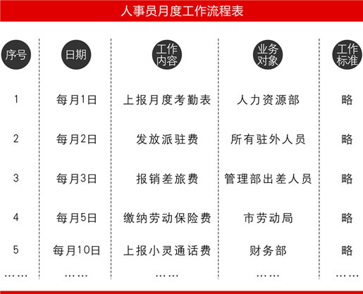 执行力,一个耳熟能详的老话题了,每一次培训都作为重点课题,每一次会议都会反复强调,可部门的执行力总难以令人满意。是员工的问题?是企业制度的问题?还是管理者自身的问题?相信很多基层管理人员都有过类似的烦恼。 要搞清楚这个问题,我们还要对“执行力”这个概念进行一番追本溯源。 何谓执行力? 执行力就是员工执行并完成任务的能力。一个员工,在上级规定的时间内,保质足量地完成工作任务,那他就是一个合格的员工。如果一个员工在时限、或在数量、质量上超出上级的期望值,以更加圆满的状态完成任务,那他就是一个优秀的员工了。 执行力的强弱有标准吗? 换言之,就是我们安排或部署的每项任务都有明确的工作时限和要求吗? 以超市管理部人事员的工作为例,每个月的主要工作有:上报月度考勤,分发驻外人员补助,报销部门差旅费,缴纳员工劳动保险费,上报驻外人员小灵通话费,等等。那么,我们如何评判他的执行力呢?有具体的工作标准吗? 当然有明确的工作时限和标准,即《人事员月度工作流程表》。