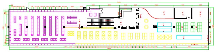 不论是老卖场改造,还是新店建设,布局是我们会遇到的第一个问题。 我看过一些搞设计的和卖货架公司做的卖场布局图,CAD图做得很漂亮,有板有眼,但是为了多卖货架,占用了很多本不该占用的通道、空间。实际上,决定顾客动线和布局的最重要因素不是货架,不是通道,而是商品结构、顾客的购物习惯、顾客的需求和商品内在的逻辑关系。 设计师在设计布局和动线的时候,最多考虑到的是货架、通道和商品结构,对于顾客的购物习惯、顾客的需求和商品内在的逻辑关系,往往考虑得不够周到。这不能完全怪罪于设计师,毕竟设计师不是商人,术业有专攻。所以,卖场的布局是经营者和设计师合作的作品,甚至主要是经营者的作品。因为只有具有丰富经验的经营者,才能从顾客的需求、习惯和经营的实际情况去把握布局中的问题。 影响布局的第一个因素: 建筑结构 关于卖场的建筑结构,除非像麦德龙自建或者沃尔玛订制,一般物业的结构是不满足要求的。越是老的物业,结构可能越不适合卖场的要求。有的曲里拐弯,像迷宫一样;有的极不规则,且到处是柱子;有的门面窄,进深长,如此种种令人煞费脑筋。不仅要考虑周全,还要充满创造力,方能解决。 下面是我们一个项目的案例,这是一家营业面积不足1000平米的超市,位于建筑物的地下室,电梯从中部下来,电梯口和收银口均位于卖场中部,卖场呈狭长状,长端近100米,窄端最狭除不足7米。 根据委托方的介绍,年节的时候,整个卖场水泄不通,顾客要手举商品才能勉强通过。而根据我们的实地观察,因为收银台位于卖场的蜂腰部位,只要一个收银道上的顾客超过5个,就可以从中间阻断卖场,阻止顾客的纵向流动。 下面是改造前卖场的布局图(见下图): ![]() 下面是改造后卖场的布局图(见下图):
