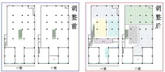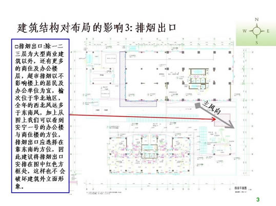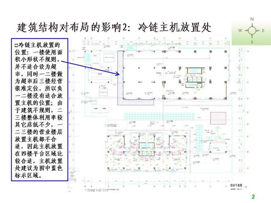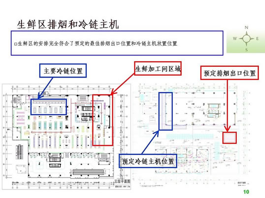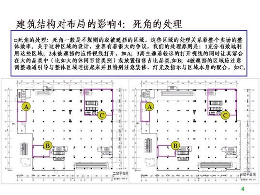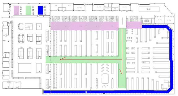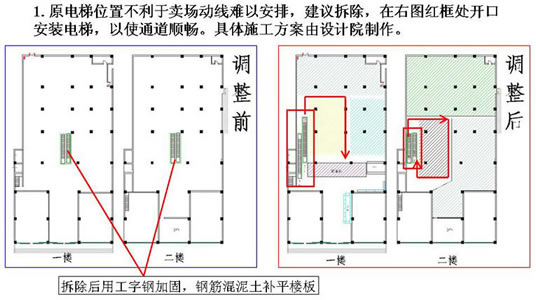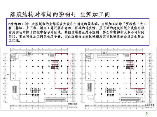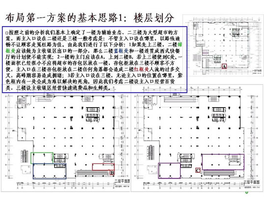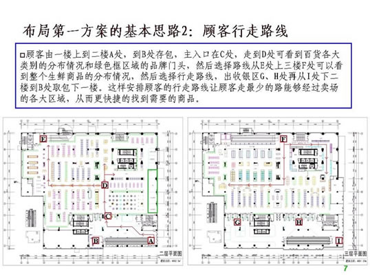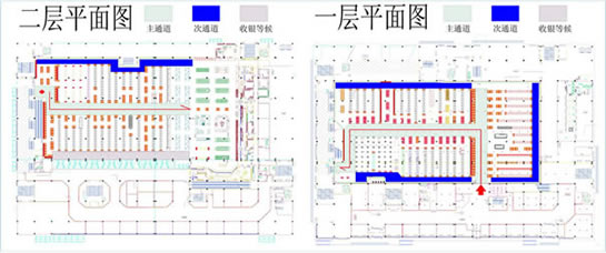 二、超市设计的前期工作 1.收集设计信息。 没有调查的凭空想象的设计方案到时会浪费不必要的时间,所以图纸设计之前对设计信息的收集极为重要。主要包括以下内容: 1)地理位置及周边情况。需要到现场和周边查看。 2)了解竞争对手,包括直接竞争对手(同业态)、类似竞争对手(不同定位的超市)、传统农贸市场(农贸市场最清楚地反映了当地生鲜情况,并且可能从中寻找到需要的生鲜资源),另外,还应该了解门店的商圈内的未来竞争对手情况,例如:政府对本商圈商业网点的规划、商圈内现有其他业态商业项目转型成为同业态竞争对手等。当然,我们还应该对企业自身现有门店进行仔细的了解。 3)企业内部对项目的整体定位,指企业内部对项目的经营业态、经营档次、主要客源等的综合经营思路。 4)超市相关的配套区域或设施需求,包括办公区、仓库、电子存包柜、烟酒专柜、服务台、顾客洗手间、清洁房/公共清洁池、工具房、耗材仓库、员工洗手间、员工更衣室、信息中心、员工饮水处、收银中心(金库)、客诉处理室、防损办公室、监控室等。 5)超市经营大类。每个企业根据自身资源及项目定位选择不同的品类区别经营,比如一些区域连锁超市的综合超市没有经营大家电。 6)生鲜经营分类详细说明。由于生鲜设计涉及到加工间、冷柜等固定设施,而且不同项目要求的设备和用电配备都不同,因此在设计之前必须详细了解生鲜经营计划。 7)其他情况了解,如生鲜是否安排单独生鲜收货通道、公司有无特殊经营项目、收银台及防盗门安装习惯等。 2. 准备设计工具。 超市设计的主要工具包括电脑、打印机和测距仪/卷尺(参见附表)。 核对内容包括: 1)柱距(净距离)、柱宽、层高、承重墙等基本数据,这是精确设计的基础。 2)已经安装的消防设施。有些消防设施可能根据后来的布局要求进行少量的调整,比如消防栓的移位,但有的是不可移动的,这时便要求在设计时合理安排。 3)周边楼宇情况,侧重考虑生鲜排烟是否会影响邻居们的工作生活。 超市平面布局介绍 一、平面布局设计的步骤 1.确定建筑是否需要调整(建筑建设之前调整相对比较简单,已经完工建筑调整涉及的事务很多,调整难度很大)。 所谓建筑结构需要调整,是指由于原建筑某些区域分割或重要设备安排造成死角、视线阻碍、通道不明、面积实用率低等不利于布局,需要进行相应的调整。常见的情况有:电梯位置不利于主通道安排或过于占用卖场面积、机房位置造成死角。调整建筑的目的一般是通畅内部交通、提升实用面积、通透视线、减少异形角落或死角等。 已完工建筑调整图例参考: 2)江西某超市:原建筑为一家大型娱乐场所,超市接手物业后决定扩大建筑面积,并在右侧安装外挂式电梯,以扩大面积、通畅动线(如图): 1)营业区域(超外、超市区)关系到店的形象、营业实用面积及收益、顾客方便度等,功能区域(收货区、仓库、办公区)关系营运效率、内部管理等;由于功能区域的问题更容易用设备和人力来解决,因此大区域分割应以营业区域优先为原则。 2)超外区与超市区的比例一般以不超过1:2为宜。 3)收货区的位置重点考虑货车的进出与停靠。 3.确定入口与出口,包括大门、超市入口、收银区、收货入口等。入口和收银区的确定使主通道一目了然,收货入口或进货电梯口(指进入销售区域的进货口)要根据仓库的位置安排在后场的角落,不少超市因为是多层建筑且每层的面积不大,常把仓库设置在较高或较低的楼层(比如仓库在四楼或负一楼),货物内部运输依靠电梯,因此各楼层的进货口常常是货梯出口。 4.确定超市内大分类的分布。我个人习惯于将超市经营商品分为四大类,在设计大型超市时也习惯于按照这个顺序排列商品大类,即一般耐用品、低值耐用品、快速消费品和生鲜商品。前几年国内不少大型连锁超市仿照家乐福的制式,把图书音像放在入口处,然后再安排一般耐用品的数码通讯和大小家电类,主要考虑的是入口旁往往留不住人,安排购买目的性很强的一般耐用品会导致入口处比较冷清。这几年随着电脑、手机及周边数码产品的普及,图书音像类别的营业额和销售数量都呈逐年下降的趋势,不少超市已经考虑到入口处虽然不留人,但至少是所有顾客都能看到路过的地方,图书音像随机性购买的特点正好与玩具及单价比较低的学生文具较为相似,不如选择将其归入文体及休闲百货类一并安排位置。