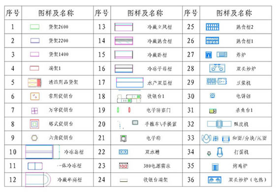 6.整理及标注:删除多余线条、物件、图层,对齐与调整,对通道及特殊陈列项目的标注,整理与图中对应的图示表。 二、平面布局设计的图纸要求 1.所有设备、物件按实际尺寸绘制,并且尽力绘制出设备及物件的平面风貌,以下是部分设备AutoCAD参考图示: 三、通道的设计 通道的宽度需要根据卖场面积、柱距等因素具体确定,没有所谓按多大面积就多大宽度的标准。通道一般以垂直于建筑轴线的直线形式为主,因为这样面积利用率最高,但并不排除根据地形及商品展示的要求和活跃卖场的需要结合弧线、斜线等应用。 根据其主要用途,我习惯把通道分为以下几种: 1.主通道:贯穿于整个卖场,让顾客走完主通道可以看到所有的商品大类。大型超市主通道的主干一般由整个卖场的中间穿过,而一些以生鲜为主的中小型卖场(生鲜加强超市)则常设置双入口,用大U型的主通道把生鲜和其它类别分开。 主通道分净主通道和促销主通道两种。选择净通道的主要原因一般是客流较大、柱距限制、消防要求,大润发常用,选择净主通道必定将促销区嵌入货架区域,这样也可以起到区域引导和避免主通道拥堵的作用。 促销主通道中促销堆头组之间的间距和与两侧端头的间距都不应小于2.5辆手推车的距离。促销主通道长度超过30米时,应该考虑在其间设置客流缓冲区,以便于顾客调整方向,尤其是年节客流高峰时段更能起到减少堵塞的作用。 2.次通道:一是沿靠墙货架走、环绕卖场的通道;二是在低货架区域用来区分商品的通道;三是主通道两侧货架之间的通道。为了在视觉上产生差异,使顾客自然行走时用更短的距离看到更多的类别,建议在建筑条件许可的情况下:主通道>次通道>货架间距。 3.货架间距:货架应垂直于主通道,货架间距同样受柱距制约,但一般也不能小于2.5辆手推车的距离。货架长度要和货架间距成正比,建议货架长度与间距之间的比例不大于8:1,也就是说两组18米长的货架间距至少宽2.25米。 货架间距可以根据区域不同、货架高度长度不同安排,总体而言,食品区域对货架间距的要求比百货区域要宽。在整理货架间距时,尽量将柱子卡在货架中,以减少柱子对陈列面的遮挡。当遇到有些柱子卡在货架中很难协调时,选择使顾客在货架间距中容易通过的方式,让柱子露出来另外处理。 4.收银等候区:指顾客结账的排队区域,一般宽度要求至少容纳3个人排队(手提篮排队宽度约0.8米,推车排队约1.2米),但具体也受到整个建筑和布局的制约。 有一部分超市为了充分利用面积,习惯在收银等候区内布置大量的堆头陈促销商品。我个人认为顾客行走到收银等候区以后,预期的购买活动基本完成,购买的意愿已经下降,不再有太多兴趣横向行走(在收银等候区来回走动)选择商品,所以不建议在收银等候区设置促销堆头,就算有足够的空间放置堆头,也不应将主力促销商品陈列于此。 5.生鲜通道:这个问题后续讨论生鲜设计时再具体展开。 下面是一家对整个中国连锁超市影响很深远的外资大型超市在国内两个比较标准的店对通道的设置,以供大家参考: 单层超市:浙江某店 货架最好选用通用式的,在丰富陈列方式的同时也考虑日后应用的稳定性,同一企业同一业态的货架规格不宜过多,以免浪费过大。 国内大型超市(不含仓储批发超市)能见到普通货架层板最宽的是630毫米(大家电有730毫米的),最高的为3200毫米(靠墙货架及大分类分割货架)。建筑层高与货架高度在某种意义上成一定正比,但不是无限制的,因为太高在正常陈列中也用不上了,而且太高要通过灯带将其视觉上线压下来。货架最高处与灯带之间最少保留600毫米的距离,这既是防火要求,也是照明考虑。我们国人个头不高,货架有效陈列高度在2米以下,再高的地方只能做寄仓和装饰背景用了。 货架的材料主要有:钢材、钢木结合;层板板面主要有钢材(包括通用型板面、钢网板面)、玻璃(带灯货架配备为主)、木材几种。层板除了直线之外还有弧形,除此之外就是用横梁配备各种挂钩或挂网,市场可见品种有超过一百多种,在平面布局过程中极少如此细致,在此不做赘述。 除了选择常规货架之外,还有一些商品类别可以选用专用货架在设计中要在图纸上表现,例如:服装架、图书音像架、内衣架、哑铃架、花盆架、自行车架等。以下是参考样式: