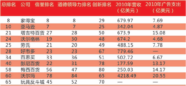 2011美国企业品牌100强出炉 《福布斯》杂志评出了“2011美国企业品牌100强”,总排名全面衡量信誉排名、道德领导力排名、创新排名三个指标,最终强生公司名列百强榜首,零售公司有11家入选,包括家得宝(第8)、亚马逊(第10)、塔吉特百货(第21)、沃尔格林(第24)、劳氏(第25)、好市多(第28)、百思买(第34)、彭尼百货(第40)、梅西百货(第58)、沃尔玛(第60)、玩具反斗城(第65)等。 ![]() 新店