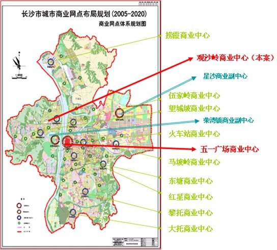 长沙为湖南省省会,位于湖南省东部,湘江下游长浏盆地西缘,南接株洲市和湘潭市,西抵娄底市,北达岳阳市、益阳市,东挨江西省宜春市、萍乡市。长沙市辖5个区4个县(市),分别为芙蓉区、天心区、岳麓区、开福区、雨花区,长沙县、望城县、宁乡县、浏阳市。 根据《长沙市城市商业网点布局规划(2005年-2020年)》公布的情况,长沙市商业体系结构为: 1个市级商业中心,即:五一广场商业中心;2个市级商业副中心,即:星沙商业副中心和荣湾镇商业副中心;10个区域性商业中心,即:火车站商业中心、伍家岭商业中心、东塘商业中心、红星商业中心、望城坡商业中心、捞霞商业中心、马坡岭商业中心、黎托商业中心、观沙岭商业中心、大托商业中心;30个社区级商业中心和18条主要商业街。