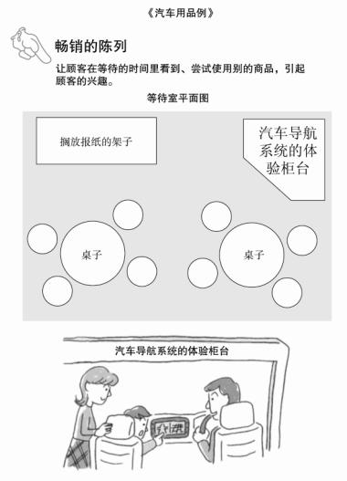 等待的时间是体验商品的绝好机会 如何让来店的顾客尽量多地看到商品、对商品产生兴趣是极为重要的课题。延长顾客的停留时间(留在店铺中的时间)也是方法之一。 那么,如何才能延长顾客的停留时间呢? 方法有很多。比如,食品超市可以将主通道设计得方便顾客行走,让顾客可以注意到各种各样的商品。或者可以建立顾客沙龙,让销售人员亲切耐心地接待顾客,从而销售高额商品等。 有些零售行业在销售商品之际需要顾客等待一段时间,我们可以有效地利用这段时间。比如,汽车用具店销售轮胎时,由于要更换旧轮胎,顾客需要等待装卸轮胎的时间。 此时,是否仅让顾客看看电视,翻翻报纸,无聊地度过这段时间就行了呢?对商家来说这是不应该的。因为这段时间是让光临店铺的顾客关注轮胎之外的商品的绝好机会。 例如,在等待室附近设置一个“商品体验柜台”,如体验汽车导航系统,应该会引起不少顾客的兴趣。虽然前来购买轮胎的顾客并不会因为一时冲动而买下汽车导航系统,但重要的是让顾客看到你的商品,试用你的商品,并对其产生兴趣。这样的话,当顾客将来有需要的时候,或是想要购买类似产品的时候,就极有可能选择您的商店、您的商品。 当然,这也就涉及到商品的独特性,以及店铺的独特性问题。 等待室是向顾客提供信息的绝佳空间。除了“商品体验柜台”以外,还可以利用各种各样的方法。比如:介绍附加服务、通过DVD影像等宣传新商品、设置样品台,让顾客看到样品、试用样品等。总之,我们应该有效地利用等待室周围的空间。