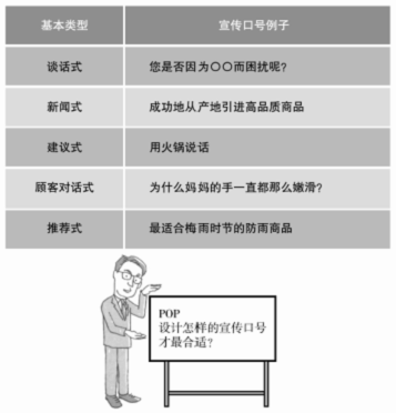 具有冲击力的宣传口号都有一定的基本模式可循,利用这些模式,您也能设计出引发顾客兴趣的口号。 1.“谈话式”口号。 “您有过这样的经历吗?”此类宣传口号可以直触顾客的内心,让顾客怦然心动的话语定能紧紧吸引住顾客的目光。 2.“新闻式”口号。 “在各大媒体中掀起了热潮!”顾客往往会注意到这种新闻式的情报信息,这类让顾客觉得错过会很可惜的宣传口号可以引起顾客的兴趣。使用报纸新闻的标题等也能带来明显的效果。 3.“建议式”口号。 “享受您的庭园派对。”以动词为重点的宣传口号能给顾客带来极好的建议,而如果使用“庭园用品专柜”的话,就无法感受到商家提供的建议。 4.“顾客对话式”口号。 用顾客群的日常对话代替厂商的话语作为宣传口号可以让POP广告妙趣横生。 5.“推荐式”口号。 “正当肥鱼味美的佳季”,在推荐特定商品时使用这类宣传口号也颇有效果。特别是当挑选商品的顾客犹豫不决时,不妨直接向其推荐“这一商品很不错”。 当顾客看到商品的特色时自然想要购买 想要让商品吸引顾客的眼球,使顾客情不自禁地想要购买,最好的方法是亮出商品的卖点。为此,大胆地改变展示也是有效的方法之一,可以彰显出商品的卖点。 比如,内衬设计得极具特色的大衣不妨大胆地摊开衣服,让顾客看到内衬;鞋底有特色的慢跑鞋可以将鞋底展示在顾客面前。