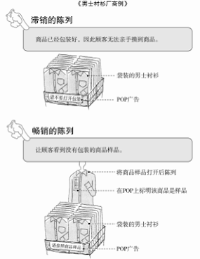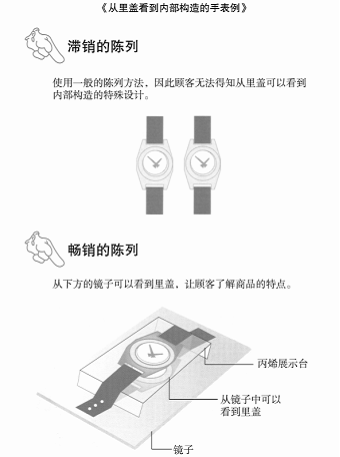 某家钟表厂商发售了一款可以从里盖看到内部构造的手表。然而,表盘朝上的普通陈列方法无法让顾客看到里盖的特殊设计。但是也不能因为这样就将手表反面陈列,否则就看不到表盘的设计了。手表是高价商品,因此陈列于展柜中,顾客也无法将其拿到手中观摩。 刚进入商场时,这款手表的销量平平。后来引进了陈列辅助工具,以便让顾客能够看到手表的里盖,利用亚克力制的展示台,将手表稍加抬起,并在下方安放了一枚镜子。从镜子中可以看到里盖的特殊设计。在引进这种亚克力展示台后,这款手表的销售额也顺利得到了增长。 不少商品的创意十分新颖,但由于无法让顾客理解其卖点,很难让顾客产生购买的欲望,所以我们需要让顾客更容易注意到商品的卖点。 对于可动型商品可以试着让其活动起来,这样展示效果更佳。卖点是声音的商品应该在陈列时发出声响,卖点是光亮的商品应该让顾客看到商品实际发光的状态,我们需要通过各种方法秀出商品的卖点。 某一中小企业主要生产各种奇特的饰品杂货,最近该公司发售了一款使用太阳能电池的风车模型。这种风车的特点是旋转速度轻缓怡人,然而销量却一直不容乐观。 该厂商调查了店内的实际情况后,发现风车被一动不动地陈列于货架上。这样就难以体现出商品的卖点。转动的风车才是真正的风车,因此社长亲自参与店铺营销,在卖场展示了旋转的风车。功夫不负有心人,销量终于有所上升。 有些商品因为包装不合适而导致顾客无法得知商品的卖点,比如文具用品类。如果将剪刀全部包装好的话,顾客就无法拿到手上试用了。通过调查得知,剪刀的刀刃部分的确需要有包装,但是如果去掉把手部分的包装,让顾客亲自握住剪刀试试手感的话,购买率将会有所上升。 工具类商品亦是如此,就算不能全部试用,至少也要设计得可以试试锤子的握感,这样才能让顾客明白商品的卖点。 所以,需要进行全包装还是半包装,这点要依据商品而定。 不能试用商品的陈列无法吸引顾客 网店等虚拟店铺无法让顾客实际看到或是接触到商品,而实体店可以做到这点,这正是实体店的优势,这也是顾客特意光顾商店的原因之一。 然而,实际上,不少商品包装得过于严实,让顾客无法亲自拿在手上体验商品。有些商品的确需要密封包装,否则会造成商品的损坏,但这类商品必须陈列有样品。这样可以防止商品的损坏,更重要的是顾客可以亲自看到、接触到商品。 比如,某一男士衬衫在商品上市的同时展示了“商品样品”和POP广告。