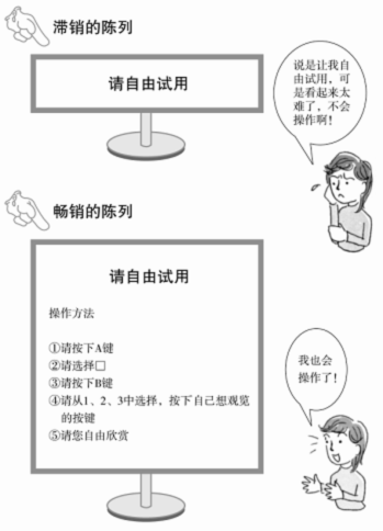 我们经常在店内看到“请自由试用”的POP。让顾客自由试用本身是方便顾客选购的举措,这点的确十分重要。然而从店铺的实际情况来看,真的达到了让顾客尝试的目的吗? 特别是一些高科技产品,就算让顾客自由试用,也有不少顾客觉得操作太难,不知道从哪儿下手。所以,POP上也不要只标明“请自由试用”,而应该做得更加详细易懂,让没有任何经验的顾客也能自由尝试。 这并不是什么很困难的事情。