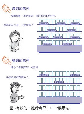 再加上马克杯本身也是五彩缤纷,因此卖场给人感觉十分愉悦且富有话题性,该款马克杯也跃升为人气商品。 让犹豫不决的顾客下定决心购买的“推荐商品” 在挑选商品之际,不少顾客因为商品种类过多,或是自己的商品知识不够而犹豫不决。对待这种顾客的有效方法是标记出“推荐商品”,直接向其推荐。不过需要注意,推荐的效果因顾客层和商品而异。有些顾客层比较容易接受“推荐商品”,而有些顾客层则不然。 比方机械商品,一般来说女性顾客和高龄顾客的“推荐商品”购买率是最高的,而年轻人则比较倾向于自己挑选商品。 此外,时尚商品和个性商品最好不要使用“推荐商品”。 “推荐商品”的关键在于仔细分析商品和顾客层的购买行为之后再作决定,这样会达到事半功倍的效果。 我们可以使用POP广告来标明“推荐商品”。(图3)