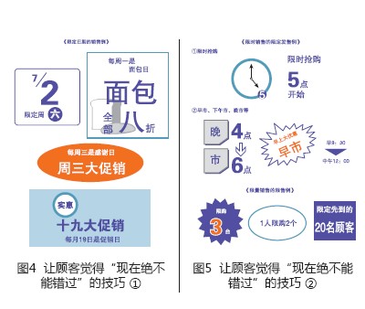 图3中的“推荐商品”过多,会导致顾客不知道该挑选哪种商品好,这种陈列方法没能理解“推荐商品”的意义。因此“推荐商品”的重点是缩小推荐的范围,只用在真正想要推荐的商品上。 让顾客觉得“现在绝不能错过”的技巧 促销难辟新径的最大原因是就算顾客对商品产生了兴趣,也觉得“无论什么时候买都一样”,因此最终没有购买商品。为了让顾客立刻购买,我们需要使顾客觉得“绝不能错过现在的机会”。方法有很多,其中最有效的是限定发售。 1、限定日期的销售(图4) ·只限今天 ·今天的特价商品 ·本周的特价商品 ·本月的特价商品 ·每周三是感谢日 ·每月20号20%OFF ·每周一某商品全部八折 ·其他