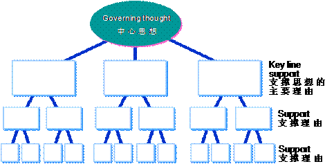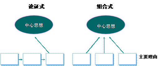 T代表瞄准观众:要围绕你的目标对象来准备你的报告,站在他们的角度去想他们需要知道什么、他们想知道什么,你就去汇报什么。 O代表周延完整:我们的汇报不是丢三落四的,而是从外延看对所涉及的问题的影响因素均已涉及,不存在遗漏的现象,也不存在避实击虚的现象。 P代表掷地有声:我们所得出的结论不是不痛不痒的,而是能够戳到问题的关键痛处的,这有助于我们一系列的后续对策的展开论述。 S代表言之有据:支撑理由对于上一级思想的支撑是很充分的,是符合逻辑的,是无法被别人推翻和否定的。 至于前面“清晰表达或者撰写故事线的要诀”中所提到的逻辑论证与逻辑组合,我们在此做一个初步的介绍。 逻辑论证的方式有两种,一种是论证式,它是以一个链状的思维方式展开的,前后的逻辑承接性非常强,因而论证某个结论的话会非常有力,给人以无可辩驳的感觉,比如我们在论证“只有社会主义才能救中国”这样的论断时,采用这样的逻辑结构就会给人一种非常严谨和强有力的感觉,但是这种论证方式也有一个弊端,那就是,一旦有一个环节不成立,那么就会如多米诺骨牌一样,整个结论都不成立;另一种是组合式,它就像多个柱子支撑一座房子一样,这种论证方式的有利点是只要有一条论证的线路是成立的,那么中心思想的结论也就成立,它的缺点是多少会给人一种勉强的感觉,在严谨性和强有力这一点上不如论证式来得干脆。