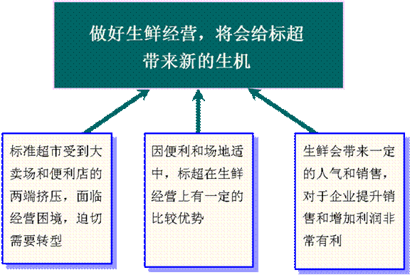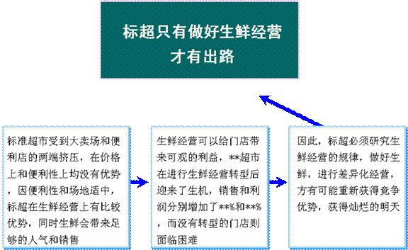 下面我们就以“标超只有做好生鲜经营才有出路”为题,采用论证式的方式来推论这个论断,如下图所示,首先我们是从生鲜经营的必要性来阐述,说明如果不推进生鲜经营必然没有出路,其次我们从现实可行性上来论证,以举例来说明推进生鲜经营对于标超的意义和价值,最后是概括前两段来个综述,那么,通过这样的结构论述,对于我们要表述“只有……才……”这样的论断就非常有力。