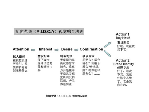 (图1) 关于Action(行动),需要特别解释一下,它不同于传统AIDCA法则中对Action的定义,达成现场购买并不是衡量橱窗促销有效与否的唯一标准,成功的橱窗商业功能规划,除了实现中的现场促销之外,还能够促进企业品牌的消费者识别,提升商标价值,促进品牌营销战略的推广。所以,很多高级时装品牌的橱窗展示,在刺激目标顾客现场消费的同时,也能让很多潜在顾客识别出品牌的独特价值,成为未来的客人。 根据这个法则,可以通过橱窗设计,逐一实现每个要素的功能。我们把这个设计的思路叫做橱窗营销的AIDCA视觉设计法则。它强调的是如何通过视觉设计的方法,来实现对应的信息传播和消费引导功能。AIDCA视觉设计法则的实施过程可以概括为如下流程(图2): 第一步:通过差异化设计引起注意,在3秒内赢得顾客的关注(Attention)。 第二步:通过夸张化设计激发好奇,挖掘顾客的潜在需求(Interest)。 第三步:通过完美演绎引发想象,制造顾客需要的体验(Desire)。 第四步:通过完整的信息和持续的品质,得到顾客的认可和信任(Confirmation)。 第五步:完整的商品信息可以回答顾客是否现场购买的疑问,持续的品质保障可以在顾客心目中树立值得期待的形象(Action-Brand Identity)。