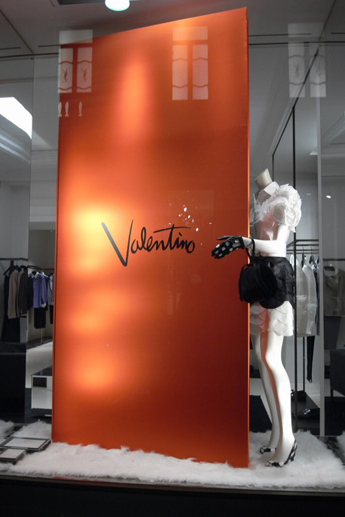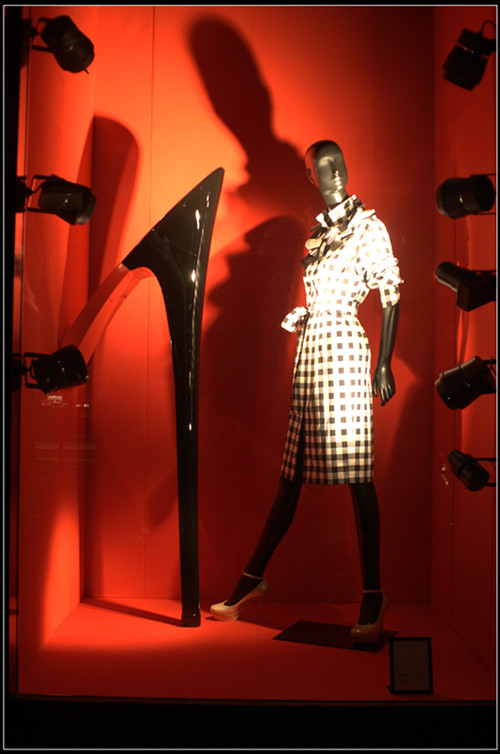 (图2) 成功的橱窗设计,正是通过这样一步一步的流程规划,来逐一实现视觉行销的功能的。如图3所示的YSL橱窗,首先通过大面积的红色背景和明暗对比的灯光来远远吸引顾客的视线,继而以夸大上百倍的高跟鞋跟作为陈列道具激发顾客进一步了解的兴趣,模特完整的产品出样形象有效地引起顾客试穿的联想,YSL一贯的品牌形象品质使顾客确认了这一品牌识别,最终形成购买或者记忆认同。