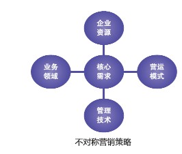 中小企业由于资源相对有限,便要从企业资源、业务领域、营运模式与管理技术四个方面寻找突破口,最终衍生出围绕顾客核心需求的不对称营销策略。 不对称营销是三种传统营销战略的融合,即低成本战略、差异化战略与专业化战略的整合。在市场竞争的压力下,大企业不断拓展业务,向多元化发展,中小企业由于资源相对有限,便要从企业资源、业务领域、营运模式与管理技术四个方面寻找突破口,最终衍生出围绕顾客核心需求的不对称营销策略(如图所示)。
