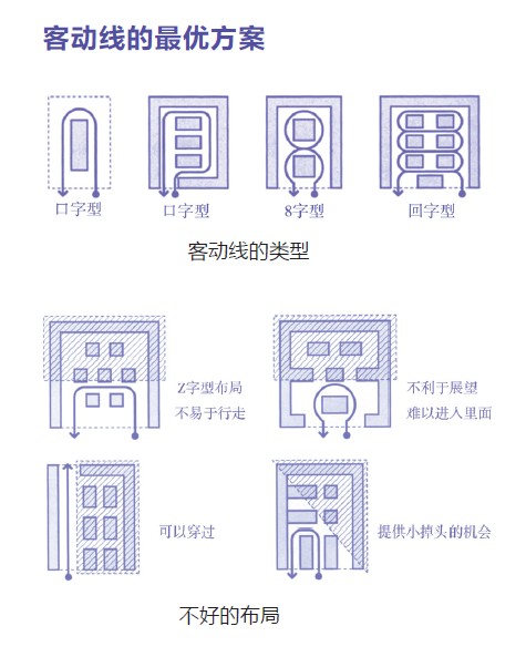 ·主动线的设定 店铺中分为主动线和辅动线。 作为主动线,要在80%的顾客通过的地方,确保最宽广的通道宽度,营造舒适的购物环境。 作为辅动线,要使其成为能够让20%的顾客停留的通道。此外,主动线与辅动线相互联动。偏离主动线即为辅动线,要使顾客方便地从辅动线返回到主动线。 理想的主动线一定是直线。因为如果通道上有高度差或一些平缓坡度的话,顾客必须不断地进行安全确认。 另外,陈列架前方边缘也不能凹凸不平。虽然有些商店由于使用的货架尺寸及支柱的原因,陈列架的前线不成一条直线,但是如此一来在就会存在安全隐患,顾客在行走中也会感觉到压力。 此外,拐角也要控制在最少限度。即使有拐角,也要将其设置成90度。因为这样容易设置陈列架。另外,如果有拐角,顾客就要进行安全确认,这样就容易中断购物意识。为了让顾客意识迅速返回到购物模式,就要对拐角设置上下工夫,使拐角前后的商品种类产生联动。