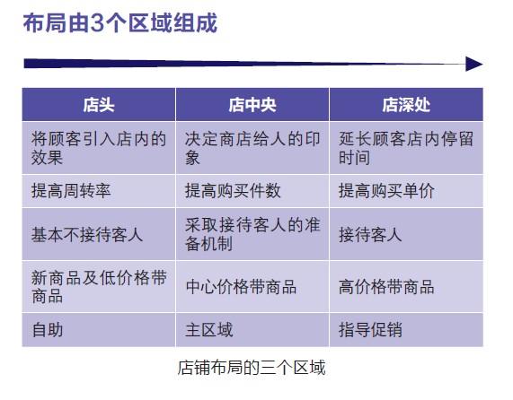 ![]() ·将入口设置在右侧 大多数人都属于右撇子,因此左脚就成为起中心作用的利脚。例如在踢足球时,右撇子的人会以左脚为中心用右脚踢球。如果是打棒球,一垒则位于右方,逆时针旋转与二垒相对。此外,在田径400m跑道上进行的田径赛及接力比赛,也是围绕跑道左侧而跑的。 无论什么都是向左进行逆时针旋转,也就是以左脚为旋转中心用右脚进行活动的模式。将分别按顺时针方向和逆时针方向进行的400m田径比赛进行比较,结果显示,按逆时针方向的奔跑时间比按顺时针方向平均缩短2秒以上。 因此,即使在商店里,入口也是位于右侧,从而描绘出向左行走的布局动线,即客动线的最优方案。 ·综合判断 然而,无论如何这只是关于“将入口设置在哪一侧”的基本思考方式。在考虑动线时,要考虑到商店前方哪一侧的通行量更大,顾客主要是通过何种方式来店等各种因素。 例如,如果车站和干线道路位于左侧,有时入口就会设置在左侧,描绘出向右行走的动线。除此以外,也要对安全对策及停车场、作业场所、事务所、送货车辆商品搬入口的位置等进行综合判断后决定商店的入口位置。 商店的形状也是很重要的因素,有正方形、长方形中的横长型、L型等各种各样的形状。如果是要在店内制作家常菜的商店,水管、煤气管的安装位置也是值得探讨的。 一旦确定了商店的布局,即使会对陈列架等配置及照明计划产生影响,也很难变更。因此,需要在事前进行充分的调查。要从交通量、商圈等因素方面收集数据进行探讨。 ·店头基本不接待客人 店铺大致可以分为3个区域。 首先,承担着将顾客引导至店内任务的是店铺入口周边区域。特别是位于入口处的橱窗陈列,具有将顾客引入店里的作用。因此应在这里陈列代表商店脸面的推销商品。 店头陈列的商品种类有提高顾客来店频率的作用,因此在该区域陈列新商品及低价格带商品,将顾客引入店内。此外,即使是为了提高商品周转率,在该处也基本不应接待客人。让顾客自行选择商品的自助卖场成为该区域的中心。 其次是店内,商店的中心部分成为卖场的主区域,在这里要设法提高顾客的购买件数。另外,该部分是中心价格区,同时也是决定商店印象的地方。从该处往里,逐渐陈列高价格带的商品。此外,广告商品是顾客来店的动机商品,是经常被购买的商品。因此要将其醒目地陈列在店前,同时也要在店里毫无遗漏地设置磁石点以提高回游性。 ·在店铺深处提高购买单价 最后是商店的深处部分,在这里主要考虑提高客单价。例如,为了延长顾客在店内的停留时间,要进行指导销售。为此,还要探讨一下准备接待客人用的桌椅问题。 此外,接待顾客要从店中央到店深处部分进行。在这里,可以从顾客的谈话中了解其需求。继而展开功能性、高附加值及高价商品的柜台。