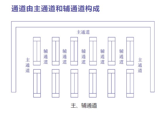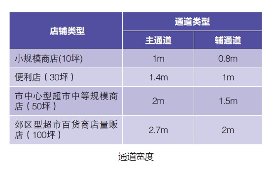 主辅通道的宽度因卖场的面积规模、布局及营业状况的不同而不同。此时,一般认为顾客的肩宽约为50cm。 另外,还有购物筐的因素。购物筐的尺寸以超市购物框为标准,小型的是便利店类型,大型手推车是郊区购物中心的类型。 |