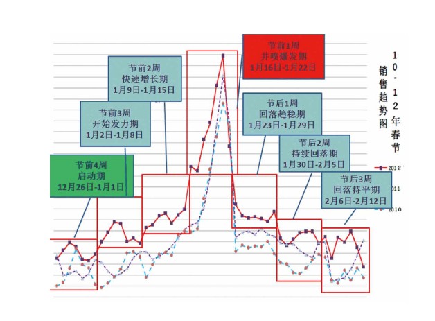 你知道在春节前42天(节前三周到节后四周)的腌腊制品销售、葡萄酒的销售、散装糖果以及白酒能占到各自全年销售的54%、50%、42%吗? 2013年春节即将到来,如何才能抓住春节的销售呢?爆发力商品怎样实现销售最大化?春节销售又分为哪几个阶段?每个阶段又有哪些表现特征……我想这一系列的问题在上图中都能找到答案。 春节销售并不简单指春节前后1周销售,从节前4周的启动期——节前3周的发力期——节前2周的快速增长期——节前1周的井喷爆发期——节后1周回落的趋稳期——节后2、3周的回落持平期,每个时期都有不同的商品表现特征,具体体现在: 1、节前4周 春节销售启动,12年环比6% 特点:销售逐步开始启动,周末效应突出 2、节前3周 销售开始发力,12年环比20% 特点:整体呈小幅震荡上扬态势,周末效应强。 3、节前2周 销售进入快速增长期,12年环比37% 特点:整体呈震荡上扬态势,本周最后一天销售达到峰值,前6天的销售与星期数密切相关。 4、节前1周 销售进入井喷状态,12年环比135% 特点:整体呈井喷态势,前4天持续攀升,至腊月二十九到达峰值。 5、节后1周 销售回落趋稳,12年环比46% 特点:整体呈震荡起伏状态,通常初二为本周最低点,后续震荡回升 。 6、节后3周 销售继续震荡下滑,12年环比8% 特点:整体继续震荡下滑,元宵节为本周峰值。 对零售业而言,春节、五一、中秋、国庆等节日并不仅仅意味着传统,更意味着实打实的真金白银,是抓销售、强利润的关键期。抓好了重点节假日的销售,也就奠定了实现全年销售的基础。而繁忙的节日销售时段中,员工的精力与各种促销资源都有限,怎样才能抓住爆发力,做好节假日的销售呢?下面将以重庆某超市为例,具体分析在春节期间各品类的销售表现。 (一)抓好春节爆发力商品的基本思路及公式 1、基本思路 所谓爆发力商品是指在特定的需求时段出现消费集中、销售周期短、销售额呈井喷爆发态势的商品。如何寻找爆发力商品,需要通过品类(至少到次中类,如碳酸饮料、果汁饮料等)在节假日与非节假日的数据表现对比,从数据表现判断该品类在节假日的销售爆发力,总结销售特点,并拟定其在备货、陈列、促销等方面的经营策略。 2、公式 判断标准:比值越大,说明此品类在节假日的销售爆发力越强;反之则较弱。品类比值越接近总销售比值,说明该品类全年销售表现比较平稳,没有太大起伏。 3、数据时段的提取 春节:春节前后三周(阴历:腊月20-正月20) 其余节假日:节前2天+节日假期3天 (二)2012年春节重庆某超市品类销售表现案例 1、以上数据春节提取时间段为节前三周到节后四周(2012年01月02日-2012年02月19日)。 2、非节假日销售=全年总销售-元旦节-春节6周销售-清明节-五一节-中秋节-国庆节 步骤一:在系统中分别按中分类提取春节及非节假日时段销售,按经营天数计算出日均销售。 步骤二:用春节时段日均销售减非节假日时段日均销售的差额除非节假日时段日均销售,得出每个品类的爆发力比值。 步骤三:用每个品类的比值与门店平均比值(43.2%)进行比较,得出两者的差额,以判断每个品类的爆发力指数。 根据上表各品类数据表现,得出: 1、酒饮、休闲、冲调及熟食类是春节期间爆发力最强的品类。 从12年各大类销售情况看,酒饮、休闲食品、冲调以及熟食类在春节前后3周销售表现突出,是门店在春节期间应当重点关注的品类。尤其是酒饮中的白酒、休闲类中的糖果、冲调中的保健品等在节假日期间销售成倍增长,抓好这些品类的节假日销售即为全年任务的达成打下基础。作为爆发力突出品类,需要我们提前作好相关准备工作,如提前的加量备货、扩大陈列排面、增加堆端陈列等,以最大化释放春节品类销售爆发力。 2、对春节期间销售累计占比前80%的次中类的关注应有所侧重。 根据品类各时段销售比值与43%的差额越大说明其春节表现越优于平时销售,从2012年春节前后三周销售累计占比前80%的次中类销售表现看,这部分品类需要关注三个方面: 一是销售绝对值大且倍数比值小的品类,如白酒类、腌腊制品类和葡萄酒类等,详见下表。 二是销售绝对值高,但销售表现比较稳定的品类,如婴儿奶粉类、洗发护发类、食用油类等,详见下表