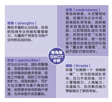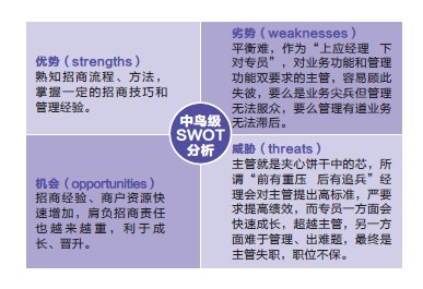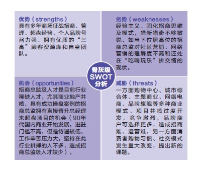之前一位做招商的同事说“做商业很有意思,招商更是件很好玩的事”,他用这种乐观、积极的态度面对招商“相中的好的求着不来,看不上的坏的求你你还不要”这种局面所产生的巨大压力,用心经营着这份职业,而非枯燥地完成工作,到达了爱好与工作合二为一的快乐境界,也取得了较好的成绩。“招商是件好玩的事”,“玩”着去招商真的是一种境界,而每个招商人员又何尝不是个玩家,其招商资历与头衔可视为是招商玩家的不同级别。从招商玩家的分类、特点、必杀技等几方面戏解招商玩家,进而了解购物中心招商中的那些人、那些事,想必是件有意思的事情! 一、招商玩家的分类 招商玩家和游戏玩家一样可分为菜鸟级、中鸟级、老鸟级、骨灰级,菜鸟级即招商专员级别、中鸟级即招商主管级别、老鸟级即招商经理级别、骨灰级自然是招商总监级别了。 二、招商玩家的特点 一)菜鸟级招商玩家——招商专员级 SWOT分析,菜鸟级招商玩家特点为初出茅庐、缺乏经验与资源;工作中易出现思路不清、目标不明、方法不当等问题;但正因为是初生牛犊,他们拥有激情、干劲、勇于挑战,不易犯下因经验主义错失商机的错误;创造性、可塑性强,成长空间大、提升机会多。 晋级秘笈,菜鸟级招商玩家如果打算晋级而不被淘汰,要做到“十分努力”,下面给出如下晋级建议:六多——多跑、多听、多问、多说、多思、多学,这“六多”堪称菜鸟级招商玩家的成长营养液。 “菜鸟”必杀技,勤能补拙、脚踏实地、坚持不懈。 二)中鸟级招商玩家——招商主管级 SWOT分析,中鸟级招商玩家特点为熟知招商流程、方法,掌握一定的招商技巧和管理经验;平衡难,作为“上应经理 下对专员”,对业务功能和管理功能双要求的主管,容易顾此失彼,要么是业务尖兵但管理无法服众,要么管理有道业务无法领先;招商经验、商户资源快速增加,肩负招商责任也越来越重,利于成长、晋升;主管就是夹心饼干中的芯,所谓“前有重压,后有追兵”,经理会对主管提出高标准,严要求以提高绩效,而专员一方面会快速成长,超越主管,另一方面难于管理、出难题,最终是主管失职,职位不保。 晋级秘笈,“五分做事,五分做人”,“树品牌、提业绩、保主管、争经理”。所谓 “树品牌”是指作为主管需从个人魅力、管理能力、业务能力等方面打造自身的品牌;“提业绩”是作为管理者要带领团队用业绩说话,提升业绩,证明实力;“保主管”是指职场生存法则,学会平衡管理与业务之间,被上级管理和管理下级之间的矛盾,先保住主管的职位,再求发展;“争经理”不言而喻就是综合提升、着眼大局的努力,争取晋升。 三)老鸟级招商玩家——招商经理级 SWOT分析,老鸟级招商玩家的特点是拥有丰富的从业经验、较强的招商专业技能和管理能力、大量商户资源及与商户谈判的实战经验;角色转换难,从主管到经理,经理作为企业中层,招商团队领导者,其职能更多的是团队管理与激励,以实现团队成长与激励,然而往往受“业务为王”思想的误导,使一些招商经理对自身定位存在局限“重业务、轻管理”,无益于团队的打造与成长;作为企业中层,团队的管理者,权限的增长可有效调用企业所提供的更多资源,促成工作推进,同时工作范畴的扩大,层级的提升,可扩大社交圈并与客户高层对接,收获更多有效的商户资源,为未来晋升夯实基础;所谓“兵熊熊一个,将熊熊一窝”,作为招商团队领导,压力不言而喻,对个人管理能力、人格魅力、沟通能力、抗压解压能力等都提出了新的考验。 晋级秘笈,“三分做事,七分做人”、建立“三高”客户资源库(所谓“三高”指:品牌量级够高、对接商户级别够高、与商户沟通效率够高)、树立行业(圈子)内的个人品牌与良好口碑、拥有操盘成功案例履历、培养自身团队(高忠诚度下属)、善于洞察,把握机遇、提升“情商、胆商、逆商”,增强抗压能力,随时应对挑战。 “老鸟”必杀技,做到“离开我,事情照做,但做不好”,建立自身重要性及不可替代性;“尊上爱下”做好公司高层领导与下属之间的“双面胶”,上传下达实现绩效;拥有高忠诚度“三高”客户资源库。 四)骨灰级招商玩家——招商总监级 SWOT分析,骨灰级招商玩家的特点是具有多年商场征战招商、管理、操盘经验、个人品牌号召力强、拥有优质的“三高”顾客资源库和自身团队;经验主义、固化招商思维及模式,猎新猎奇不够敏锐(如当下位居高位的招商总监对社区营销、网络营销的理解度不高和还处在“吃喝玩乐”拼交情的现状);招商总监级人才是目前行业稀缺人才,尤其商业地产井喷,具有成功操盘案例的招商总监拥有直接晋升总经理来操盘项目的机会(90年代国内商业开始发展,进驻门槛不高,但是待遇较低,工作辛苦压力大,坚持在此行业拼搏的人不多,造成招商总监级人才较少);一方面购物中心、城市综合体、主题商业、网络电商、品牌旗舰等多种商业模式、项目井喷,过度开发,竞争激烈,品牌商户有更多的选择,造成招商难、运营难,另一方面消费者购物习惯、社交模式发生重大改变,想购物中心提出新的课题。 晋级秘笈,做到“三分做人 七分做事”这里的事是指方向、结果、责任。培养自己成为多面手,成为商业专家、战略家、思想家、社会学家、时尚控、哲学家甚至是教育家的多面“大家”。 “骨灰级”必杀技个人