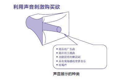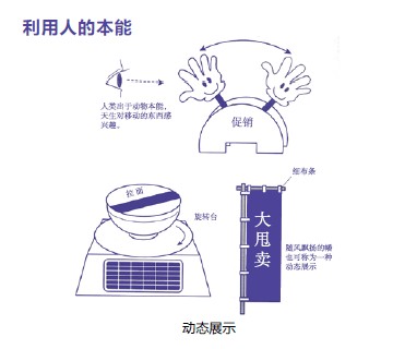 为枯燥无味的货架上添加创意 陈列商品的货架最重视功能性。因此,货架的材质大多为枯燥无味的金属和塑料,颜色也多为土黄色等。 例如,某家有名的服装店采用的是使人感觉凉爽的铁架。这种设计简约且不易令人厌烦,组装及重装也很简单。此外,货架板也是网眼型,可以说是优先清洁度的一大表现。 将商品陈列在这样的货架板上,有一种下有铺垫、体现差别化的展示效果。 例如,如果是高附加值的电器产品,就用缎纹织布将货架整体遮住,用高级感演绎高价格带的商品构成。如果是女儿节和端午节等,就把红色和粉色的布铺设在陈列架整体上,以此烘托出节日的气氛。 此外,还要运用易于顾客联想的颜色,如蔬菜和水果就用绿色系,海产品就用天蓝色系等。如果使用网眼状的无纺布,即使将商品直接放置上去也不会损坏。 最近也开始出现绚丽多彩的薄纸铺垫物 最近,铺垫物中也开始出现印有各种图案的彩色薄纸,对此要针对卖场种类和主题分别使用。除了铺垫以外,有的地方也在使用麦秆编成的篮子。 在有些商店,还可以看到将自行车和高尔夫球袋直接陈列在地板上进行销售的场景。但是,重要的商品不应放置在地面上,最好铺设人工草坪等,然后将商品放置在上面。 人类对动态物体非常敏感 在静态卖场中,动态物体的醒目度会大大提升且很有效。例如,店头随风飘扬的三角旗、挂毯(垂幕)、幡以及闪烁的闪光灯招牌。在卖场中,摇摆标签及吸收天花板灯头光线而晃动的太阳能型POP等的注视率也很高并效果显著。 我们人类天生对动态物体非常敏感,并表现出莫大兴趣。原因在于人类本身是一种动物,所以对移动的物体是敌是友会在瞬间进行确认。 因此,人类一定会注视进入视线的动态物体。正因如此,如果能使顾客对其无意间看到的POP信息感到有兴致,该商品的购买率就会上升。 如今,通过喷墨技术,可以制作出一面以上的五色幡。在旗杆穿过幡的地方,使用细带子与幡两面相接,这种加工可由专业人员很简单地制作出来。 动态物体的注意事项 要注意的是,由于其是随风飘扬的动态物体,需要固定其根部。而且,在幡等物体中,要使用制动器以使其不被强风卷起。 同时,由于处于活动状态,动态物比固定物更容易起皱和损坏。如果是在室外,日晒和雨淋还会使其褪色。 但是,有一些商店会继续使用在室外被日晒后起皱的幡,这就像是在亲自宣告自己店里很邋遢一样。让我们注意定期更新吧! 唤起顾客的想象力 卖场中有时会循环播放电视广告曲。这是一种通过在卖场播放此种曲目来提高顾客购买欲望的展示。如今也有销售专用的音乐出售。 此外,也可以通过顾客路过时会产生反应的带IC片的传感器效果音和微型液晶电视的图像及音乐来激发顾客的购买欲望。 对具备功能性和高附加值但需要说明使用方法的商品,利用带录像带的电视来播放配有解说词的图像进行介绍,也是卖场常用的促销手法。 如果是中国的食材卖场,则在锅里放入油翻炒时的“嗞啦”声就会成为展示的声音;如果在鲜鱼卖场,则船舶的引擎声和海鸟的叫声就会成为展示的声音。 此外,如果是与夏季商品相关的卖场,要将蝉叫声和小河流淌等声音作为效果音播放。通过音乐效果可以使顾客联想到该卖场主题的生活场景。此外,在鲜鱼卖场,配合傍晚的黄金时间,也可使用吆喝声来演绎喧闹感。 注意音量 如果在刚开门的空旷卖场里播放大音量的音乐,会使人丧失兴致。要播放,就把音量调到最小,待顾客逐渐增多时再提高音量。 声音展示具有烘托购物环境舒适性和传递卖场信息的功能。而且,音乐效果可以激发顾客的购买冲动。