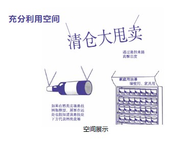 空间仍有很大利用余地 最近,郊区大型商店的数量在增加,店铺面积也在扩大。然而在此之前,在狭小的卖场里如何陈列商品,一直是一大课题。但是,由于一直将卖场效率置于优先地位,故在空间展示上仍有探讨的余地。此外,通常意义上的漂亮摆放,并不是真正的空间展示。作为店方,不要仅将这一工作委托给专业人员,还应了解自身能做些什么。 至于所谓陈列中的空间展示,主要是指空中展示。例如,张贴POP时,如何巧妙地运用空间等。 悬挂POP 悬挂方式就充分运用了空间。只要在天花板上悬挂与实物同样大小的商品模型,就能起到引起顾客注意的作用,作为下方陈列商品的标志。 此外,张贴在墙壁上的海报,也可以进行悬挂。这样,从店头看来就成了悬在空中的形象,帮助醒目度上升。 货架上的广告板有时也悬挂在天花板上。但是,不要将其固定在货架上方,而是将其悬浮以谋求较高的醒目度。同时,也可以将其四角悬挂起来制造出角度,来提高POP的面积识别率。 如果是拐角的卖场上方,则可以充分利用该斜面,通过广告板和旗帜来提高醒目度,使该处成为充满商机的角落。 此外,为了悬挂而使用丝线(尼龙丝)时,为安全起见应多使用几根,一根丝线断裂时,尚有其他丝线可以支撑。 |