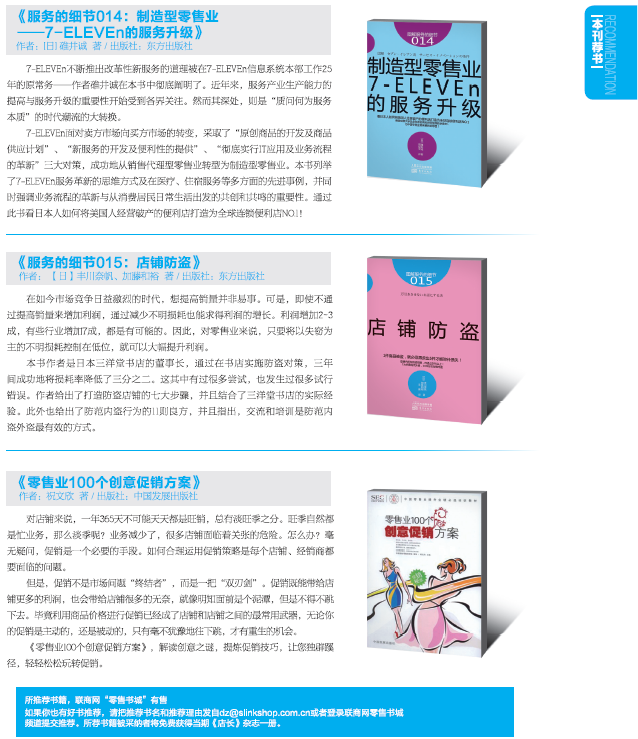 -=刊于2014年4月刊=- 本刊荐书 《服务的细节014:制造型零售业——7-ELEVEn的服务升级》 作 者:[日] 碓井诚 著 出 版 社:东方出版社 7-ELEVEn不断推出改革性新服务的道理被在7-ELEVEn信息系统本部工作25年的原常务——作者碓井诚在本书中彻底阐明了。近年来,服务产业生产能力的提高与服务升级的重要性开始受到各界关注。然而其深处,则是“质问何为服务本质”的时代潮流的大转换。 7-ELEVEn面对卖方市场向买方市场的转变,采取了“原创商品的开发及商品供应计划”、“新服务的开发及便利性的提供”、“彻底实行IT应用及业务流程的革新”三大对策,成功地从销售代理型零售业转型为制造型零售业。本书列举了7-ELEVEn服务革新的思维方式及在医疗、住宿服务等多方面的先进事例,并同时强调业务流程的革新与从消费居民日常生活出发的共创和共鸣的重要性。通过此书看日本人如何将美国人经营破产的便利店打造为全球连锁便利店NO.1! 《服务的细节015:店铺防盗》 作 者: 【日】丰川奈帆、加藤和裕 著 出 版 社:东方出版社 在如今市场竞争日益激烈的时代,想提高销量并非易事。可是,即使不通过提高销量来增加利润,通过减少不明损耗也能求得利润的增长。利润增加2~3成,有些行业增加7成,都是有可能的。因此,对零售业来说,只要将以失窃为主的不明损耗控制在低位,就可以大幅提升利润。 本书作者是日本三洋堂书店的董事长,通过在书店实施防盗对策,三年间成功地将损耗率降低了三分之二。这其中有过很多尝试,也发生过很多试行错误。作者给出了打造防盗店铺的七大步骤,并且结合了三洋堂书店的实际经验。此外也给出了防范内盗行为的11则良方,并且指出,交流和培训是防范内盗外盗最有效的方式。 《零售业100个创意促销方案》 作 者:祝文欣 著 出 版 社:中国发展出版社 对店铺来说,一年365天不可能天天都是旺销,总有淡旺季之分。旺季自然都是忙业务,那么淡季呢?业务减少了,很多店铺面临着关张的危险。怎么办?毫无疑问,促销是一个必要的手段。如何合理运用促销策略是每个店铺、经销商都要面临的问题。 但是,促销不是市场问题“终结者”,而是一把“双刃剑”。促销既能带给店铺更多的利润,也会带给店铺很多的无奈,就像明知面前是个泥潭,但是不得不跳下去。毕竟利用商品价格进行促销已经成了店铺和店铺之间的最常用武器,无论你的促销是主动的,还是被动的,只有毫不犹豫地往下跳,才有重生的机会。 《零售业100个创意促销方案》,解读创意之谜,提炼促销技巧,让您独辟蹊径,轻轻松松玩转促销。 |
