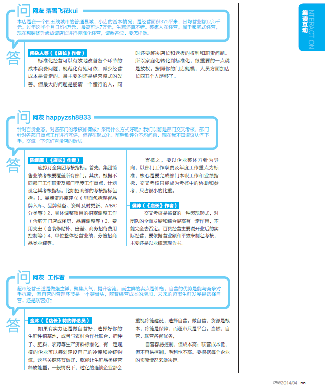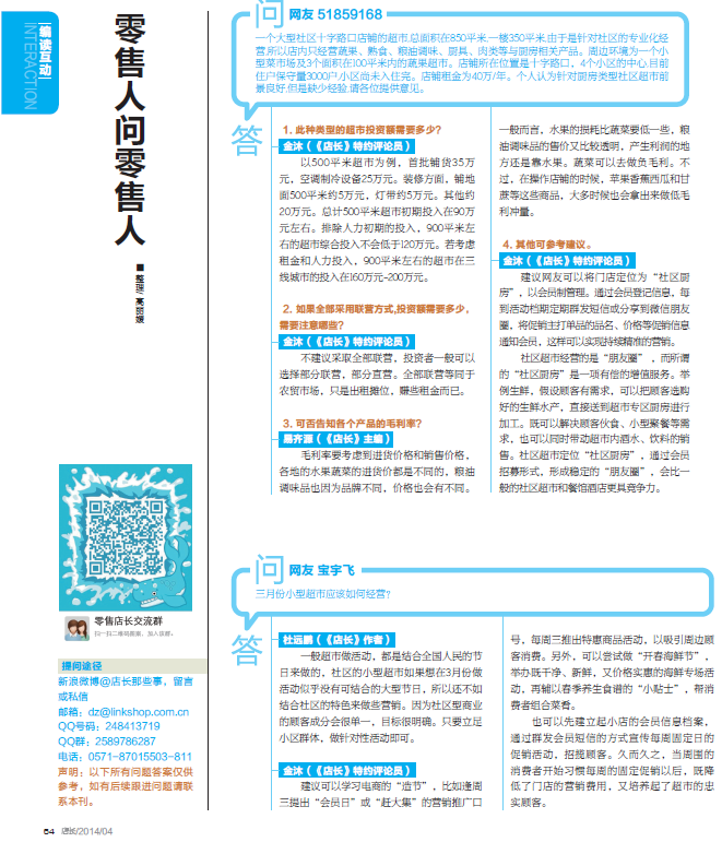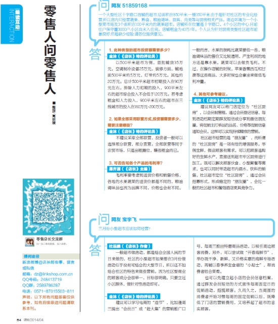 店总之道•解惑 零售人问零售人 整理/高丽媛 声明:以下所有问题答案仅供参考,如有后续跟进问题请联系本刊。QQ:2589786287 1、 问:网友 51859168 一个大型社区十字路口店铺的超市,总面积在850平米,一楼350平米,由于是针对社区的专业化经营,所以店内只经营蔬果、熟食、粮油调味、厨具、肉类等与厨房相关产品。周边环境为一个小型菜市场及3个面积在100平米内的蔬果超市。店铺所在位置是十字路口,4个小区的中心,目前住户保守量3000户,小区尚未入住完。店铺租金为40万/年。个人认为针对厨房类型社区超市前景良好,但是缺少经验,请各位提供意见。 (1)此种类型的超市投资额需要多少? 答: 金沐(《店长》特约评论员) 以500平米超市为例,首批铺货35万元,空调制冷设备25万元。装修方面,铺地面500平米约5万元,灯带约5万元。其他约20万元。总计500平米超市初期投入在90万元左右。排除人力初期的投入,900平米左右的超市综合投入不会低于120万元。若考虑租金和人力投入,900平米左右的超市在三线城市的投入在160万元-200万元。 (2)如果全部采用联营方式,投资额需要多少,需要注意哪些? 答: 金沐(《店长》特约评论员) 不建议采取全部联营,投资者一般可以选择部分联营,部分直营。全部联营等同于农贸市场,只是出租摊位,赚些租金而已。 (3)可否告知各个产品的毛利率? 答: 易齐源(《店长》主编) 毛利率要考虑到进货价格和销售价格,各地的水果蔬菜的进货价都是不同的,粮油调味品也因为品牌不同,价格也会有不同。一般而言,水果的损耗比蔬菜要低一些,粮油调味品的售价又比较透明,产生利润的地方还是靠水果。蔬菜可以去做负毛利。不过,在操作店铺的时候,苹果香蕉西瓜和甘蔗等这些商品,大多时候也会拿出来做低毛利冲量。 (4)其他可参考建议。 答: 金沐(《店长》特约评论员) 建议网友可以将门店定位为“社区厨房”,以会员制管理。通过会员登记信息 ,每到活动档期定期群发短信或分享到微信朋友圈,将促销主打单品的品名、价格等促销信息通知会员,这样可以实现持续精准的营销。 社区超市经营的是“朋友圈” ,而所谓的“社区厨房”是一项有偿的增值服务。举例生鲜,假设顾客有需求,可以把顾客选购好的生鲜水产,直接送到超市专区厨房进行加工。既可以解决顾客伙食、小型聚餐等需求,也可以同时带动超市内酒水、饮料的销售。社区超市定位“社区厨房”,通过会员招募形式,形成稳定的“朋友圈”,会比一般的社区超市和餐馆酒店更具竞争力。 2、问:网友 宝宇飞 三月份小型超市应该如何经营? 答: 杜远鹏(《店长》作者) 一般超市做活动,都是结合全国人民的节日来做的,社区的小型超市如果想在3月份做活动似乎没有可结合的大型节日,所以还不如结合社区的特色来做些营销。因为社区型商业的顾客成分会很单一,目标很明确。只要立足小区群体,做针对性活动即可。 金沐(《店长》特约评论员) 建议可以学习电商的“造节”,比如逢周三提出“会员日”或“赶大集”的营销推广口号,每周三推出特惠商品活动,以吸引周边顾客消费。另外,可以尝试做“开春海鲜节”,举办既干净、新鲜,又价格实惠的海鲜专场活动,再辅以春季养生食谱的“小贴士”,帮消费者组合菜肴。 也可以先建立起小店的会员信息档案,通过群发会员短信的方式宣传每周固定日的促销活动,招揽顾客。久而久之,当周围的消费者开始习惯每周的固定促销以后,既降低了门店的营销费用,又培养起了超市的忠实顾客。 3、问:网友 工作着 超市经营王道是做强生鲜,聚集人气,提升客流,而生鲜的卖点是价格,自营的优势是能与竞争对手抗衡,但自营的管理环节是一个硬骨头,随着经营成本的增加,未来的超市生鲜发展是选择自营,还是联营好? 答: 金沐(《店长》特约评论员) 如果有实力还是做自营好,选择好你的生鲜种植基地,或者与农村合作社联合,把种子、肥料、农药等生产资料标准化,有一定规模的企业可以筹划建设自己的冷库和冷链物流,这些关键环节做好,就能让生鲜品类经营释放能量。一般情况下,过亿的连锁企业都会重视冷链建设,选择自营。做自营,货源是根本,冷链是保障,而超市只是平台。当然,自营、联营各有优劣, 自营容易控制,但成本高;联营成本低,但不容易控制,毛利也不高。要根据每个企业的实际情况来做决定。 4、 问:网友 落雪飞花kui 本店是在一个四五线城市的普通县城,小店的基本情况:是经营面积375平米,日均营业额1万5千元,过年这半个月日均4万元,最高可达7万元,生意还算不错。整家人在经营,属于家庭式经营,现在想装修升级成请店长进行标准化经营,请教各位,要怎样做。 答: 闲杂人等(《店长》作者) 标准化经营可以有效地改善各个环节的成本浪费问题,规范化有矩可依,减少经营成本是肯定的。最主要的还是经营模式的改善。但最大的问题是能请一个懂行的人,同时还要解决店长和老板的权利和职责问题。所以家庭化转化到标准化,很重要的一点就是放权。按照你的门店规模,人员方面加店长四五个人足够了。 5、问:网友 happyzsh8833 针对百货业态,对各部门的考核如何做?采用什么方式好呢?我们以前是部门交叉考核,部门针对各部门重点工作进行互评,但存在形式化、前后勤评分不均问题,现在我不知道该从何下手,交流一下你们百货店的做法。 答: 陈继展(