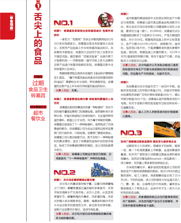 【PART 1】 舌尖上的食品 关键词:过期、食品卫生、转基因 相关零售行业:超市、餐饮业 NO.1 问题1: 肯德基豆浆被检出含转基因成分 包装并未标识 一家名为“花椒网”的安全评测视频网站在2月19日发布视频显示,肯德基豆浆含有转基因大豆成分,且相关产品包装上并未有转基因食品标识。此前曾有专家指出,转基因大豆如用于加工豆浆存在不确定风险。据花椒网“花椒实验室”与国内第三方检测机构——华测检测一道对市面上各大品牌的豆浆产品进行转基因检测后发现,肯德基豆浆中含有转基因大豆成分。 根据国家质检总局发布实施的《食品标识管理规定》规定,“属于转基因食品或者含法定转基因原料的(食品)”需要标注中文说明,然而调查发现,肯德基的豆浆产品上并未有任何转基因食品的标识。 当事人回应: 问题2: 肯德基更换包装内幕 神秘香料蒙骗世人半世纪