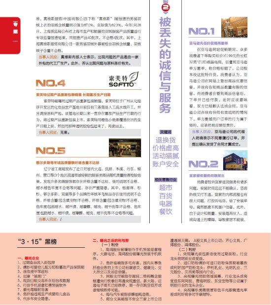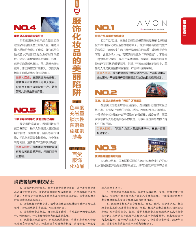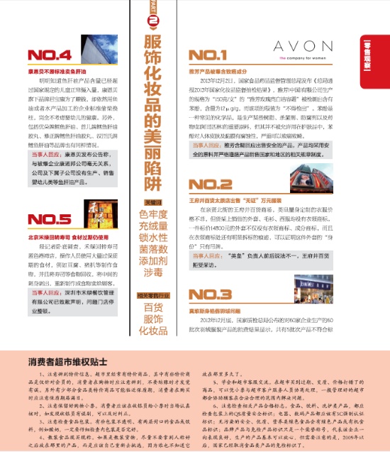 问题1: 沃尔玛买蟹绑蟹绳比蟹还重 沃尔玛大利嘉店卖的梭子蟹,总重5.9两绑蟹绳占了3两5。螃蟹穿重装已遍及福州多家超市、农贸市场及海峡水产交易市场。业内人士称,从批发到零售环节,螃蟹绑绳的内幕多,用多重的绳、用多长的绳大多由商贩来定。据悉,福建省和福州市至今未出台相关的规范性文件,缺乏相关法律依据,导致行业监管存在盲区,造成市场乱象存在。 当事人回应: 沃尔玛方面已经将拇指粗的橡皮绳改为细的橡皮筋。 问题2: 超市销售的韩国海苔中文标签注明的生产日期实为保质期,消费者以超市卖过期食品构成欺诈为由,将北京沃尔玛百货有限公司建国路分店告上法庭,要求对方退一赔十。2013年8月,消费者在沃尔玛建国路店购买了16包单价为19.8元、产地为韩国的海苔,共计316.8元。根据海苔包装上的中文标签显示,生产日期为2012年12月5日,保质期1年。食用后,他发现口味不对,于是请懂韩语的朋友查看外包装。朋友称,根据包装上印着的韩文,2012年12月5日是海苔的到期日期,根本不是生产日期,而他购买之日海苔早已过期。 当事人回应: 沃尔玛超市认可该批自销进口海苔的标签存在将生产日期与保质期时间印刷错误的问题,但这是生产方的错误,与超市无关。 问题3: 有消费者在沃尔玛超市买了一块切片年糕,结账时发现发票上的年糕价格是4.5元,而超市年糕柜台处看到的促销广告和价格标签都是3.9元/个。确认年糕价格是3.9元/个后,消费者从超市获赔多收的六毛钱。而对于促销价格的变动超市自始至终没有一句道歉的话。 当事人回应: 超人工作人员称系统内的价格错难以避免。 NO.3 杭州广琪销售过期食品原料 直供浮力森林等企业 过期两年之久的原料,爬满虫子的面粉,摇身一变、换一个标签就重新上市销售,走进消费者的餐桌。杭州市广琪贸易公司销售过期食品原料被央视曝光,其供应对象包括Breadtalk(面包新语)、浮力森林、可莎蜜儿等多家知名烘焙企业。 在央视的曝光中,最多呈现的就是该公司如何修改生产日期和保质期限的画面:到2013年8月就过期的原料,经工人修改,保质期瞬间延长到了2014年4月;不同的包装,该公司的修改方法也是五花八门,擦、剪、贴、分袋等无所不用其极,最终改头换面都流入了烘培企业,这其中并不乏一些为大众所知的知名品牌。 当事人回应: 多家蛋糕烘焙企业均已暂停使用杭州广琪原料,涉及的问题产品也已全部撤架,并无条件接受消费者退卡退款。 NO.4 明明知道鱼肝油产品含量已经超过国家规定的儿童正常摄入量,康恩贝旗下品牌君宝康为了赚钱,却依然用鱼油或者水产品加工的企业标准偷梁换柱,完全不考虑婴幼儿的健康。另外,包括优朵牌鳕鱼肝油、首儿牌鳕鱼肝油胶丸、修正牌鳕鱼肝油胶丸、汉臣氏牌鳕鱼肝油等品牌也有同样情况。 当事人回应: 康恩贝发布公告称,与被爆企业康诺邦公司毫无关系,公司及下属子公司没有生产、销售婴幼儿类等鱼肝油产品 NO.5 北京禾绿回转寿司食材过期仍使用 经记者卧底调查,禾绿回转寿司蓝色港湾店,操作人员使用大量过了保质期的食材,例如豆腐、猪扒等制作食物,并且将寿司等食物回收,将中间的刺身剥出,重新制作成食物卖给顾客。 当事人回应: 深圳市禾绿餐饮管理有限公司已致歉声明,问题门店停业整顿。 消费者超市维权贴士 1、注意辨别特价信息。超市里经常有特价商品,其中有些特价商品是仅针对会员的,消费者在购物时应注意辨别,不要结账时才发觉有误。另外有少部分食品类特价商品可能临近保质期,消费者在购买时应注意保质期届满日。 2、注意保留好购物小票。消费者应该在收银员给小票时当场认真核对,如发现收银员有误刷,可以及时纠正。 3、注意检查食品包装。有些包装不透明、有两层封口的食品或饮料,例如酸奶,一定要仔细检查内包装是否完好。 4、散装食品现买现称。如果是散装货物,尽量不要拿别人称好之后放在那里的产品,而是应该自己重新去挑选,因为谁也不知道它放在那里多久了。 5、学会和超市客服交流。在超市买到过期、变质、价格打错了的商品,可以凭小票与超市客户服务人员协商处理,一般管理好的超市都会协助顾客在合法合理的范围内解决问题。 6、注意检查相关产品合格标志。食品、饮料、洗护类产品,都应检查包装上的QS质量安全标识;电器、数码产品都应该有3C强制认证标识;无污染的安全、优质、营养类绿色食品会有绿色产品或有机食品标识;品牌产品与免检产品标识只是一个荣誉称号,代表该企业一向表现良好,生产的产品基本可以放心,但需要注意的是,2009年以后,国家已经取消食品类产品的免检标识了。 【PART 2】 服饰化妆品的美丽陷阱 关键词:色牢度、充绒量、锁水性、菌落数、添加剂、涉毒 相关零售行业:百货、服饰、化妆品 NO.1 雅芳产品被曝含致癌成分 2013年12月2日,国家食品药品监督管理总局发布《总局通报2013年国家化妆品监督抽检结果》,雅芳(中国)有限公司生产的规格为“150克/支”的“雅芳玫瑰亮白洁容霜”被检测出含有苯酚,含量为12μg/g,而该项的限值为“不得检出”。苯酚是一种常见的化学品,是生产某些树脂、杀菌剂、防腐剂以及药物(如阿司匹林)的重要原料,但其并不被允许用在护肤品中,苯酚对人体皮肤及黏膜有腐蚀性,严重可以致癌致畸。 当事人回应: 雅芳含糊回应出售安全的产