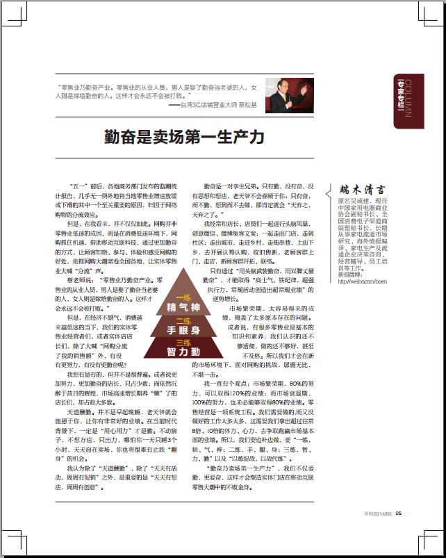 “零售业乃勤奋产业。零售业的从业人员,男人是娶了勤奋当老婆的人,女人则是嫁给勤奋的人。这样才会永远不会被打败。” --台湾3C店铺营业大师 蔡松基 勤奋是卖场第一生产力 文/端木清言 “五一”前后,各地商务部门发布的监测统计报告,几乎无一例外地将当地零售业增速放缓或下滑的其中一个至关重要的原因,归因于网络购物的分流效应。 但是,在我看来,并不仅仅如此。网购并非零售业低迷的成因,而是在消费低迷环境下,网购抓住机遇,借助移动互联科技,通过更加勤奋的方式,让顾客知晓、参与、体验和感受网购的好处,助推网购大潮席卷全国各地,让实体零售业大喊“分流”声。 蔡老师说:“零售业乃勤奋产业。零售业的从业人员,男人是娶了勤奋当老婆的人,女人则是嫁给勤奋的人。这样才会永远不会被打败。” 但是,在经济不景气,消费越来越低迷的当下,我们的实体零售业经营者们,或者实体店店长们,除了大喊“网购分流了我的销售额”外,有没有更努力,有没有更勤奋呢? 我想有是有的,但并不是很普遍。或者说更加努力,更加勤奋的店长,只占少数;而依然沉醉于昔日的辉煌,市场高速增长期养“懒”了的店长们,却占着大多数。