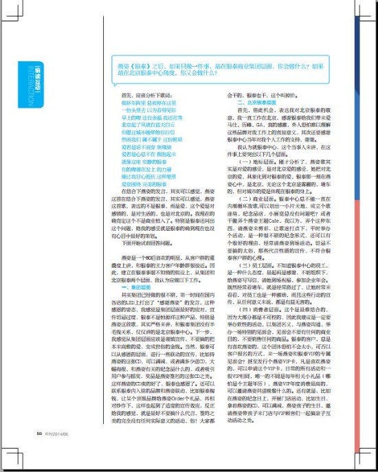 你的吻落在发上 的力量 能让我甘心抵抗 这种绝望 爱意围绕 完美的银泰 在结合下燕姿的发言,其实可以感觉,燕姿这首歌,表达的不是银泰,而是爱,这个爱是对感情的,是对生活的,也是对北京的。我现在的确肯定这个不是商业植入了。特别是银泰还问出这个问题,给我的感受就是银泰的确到现在也没有心目中最好的策划。 下面开始试着回答问题。 燕姿是一个80后喜欢的明星,从客户群的重叠度上讲,和银泰的主力客户年龄群很接近。因此,建立在银泰事前不知情的假设上,从集团和北京银泰两个层面,我认为应做以下工作。 一、集团层面 其实集团已经做的很不错,第一时间在国内各店的LED上打出了“感谢燕姿”的发言,这种感恩的姿态,我感觉是集团层面最好的应对,宣传切忌过度,银泰不是恒源祥这种产品,特别是燕姿这首歌,其实严格来讲,和银泰集团没有半毛钱关系,仅仅讲的是北京银泰中心。下一步,我感觉从集团层面应该是谨慎宣传,不要搞的把本来高雅的爱,变成世俗的金钱。当然,银泰可以从感恩的层面,进行一些联动的宣传,比如持燕姿的这张CD,可以满减,或者满多少送CD,大幅海报,和燕姿有关的纪念品什么的,或者吸引用户参与摇奖,奖品是燕姿签名的这张CD之类。这样燕姿的CD卖的好了,银泰也感恩了。还可以联系银泰内入驻的品牌和燕姿联动,比如银泰掏钱,让某个顶级品牌给燕姿Order个礼品,再相对炒作下,这样也起到了适度的宣传效应,反正给我的感觉,就是最好不要搞什么代言,签约之类的完全没有任何实际意义的活动,俗!大家都会干的,银泰也干,这个叫掉价。 二、北京银泰层面 首先,借此机会,表达我对北京银泰的敬意,我一直工作在北京,感谢银泰给我们带来爱马仕、历峰、GA,真的感激,外人恐怕难以理解这些品牌对我工作上的直接意义,其次还要感谢银泰中心当年对我个人工作的支持,谢谢。 我认为就银泰中心,这个当事人来讲,在这件事上要突出以下几个层面。 (一)地标层面。刚才分析了,燕姿歌其实是对爱的感受,是对北京爱的感受,她把对北京的爱,具象化到对银泰的爱,银泰那一刻在燕姿心中,是北京,无论这个北京是雾霾的,堵车的,但对城市的爱是体现在银泰的身上。 (二)商业层面。银泰中心总不能一直在内部循环放歌,可以划出一小片天地,成立个歌迷角,纪念品店,小展览总没有问题吧?或者干脆弄个燕姿主题Cafe,我以为,弄个这种东西,请燕姿来剪彩,让歌迷打点下,平时举办个活动,是一种很不错的纪念形式,还可以有个很好的理由,经常请燕姿到场活动。切忌不要搞的太俗,那些代言性质的宣传,不符合银泰客户群的心理。 (三)员工层面。不知道银泰中心的员工,是一种什么态度,最起码是感谢,不妨组织下,给燕姿写写信,请她到场祝福,参加企业年会。既然经常看堵车,就是经常路过了,让她时常来看看,对员工也是一种激励,而且这些行动的宣传,从任何意义来说,都是有益无害的。 (四)消费者层面。这个是最难结合的,因为大部分都是不可控的,因此我建议是一定要举办软性的活动,以集团名义,与燕姿沟通,举办一场特别的见面会,见面会不要有任何的商业目的,不要销售任何的商品。银泰的客户,总是有喜欢燕姿的,这个团体恐怕不会太小,可否以客户报名的方式,来一场燕姿和银泰VIP的专属见面会?甚至发行个燕姿VIP卡,凡是喜欢燕姿的,可以申请这个VIP卡,日常的所有活动和一般VIP相同,唯一的不同是每年相关小礼品(哪怕是个主题年历),燕姿VIP年度消费最高的,可以邀请燕姿共进晚餐什么的。还有就是,比如在燕姿的纪念日上,开展门店活动,比如生日,拿着燕姿的CD,可以满减,燕姿孩子的生日,邀请燕姿带孩子来门店与VIP顾客们一起搞亲子互动活动之类