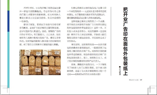 2010年10月,日本优衣库计划在法国巴黎开一家超大型的旗舰店。考虑作为时尚之都的巴黎人对服装特别的挑剔,优衣库创始人兼社长柳井正决定亲自挂帅,负责开业前的一切事宜。 柳井正深知,要想在开业的当天吸引更多的顾客,必须扩大优衣库在巴黎的知名度,让尽可能多的人知道它。因此,前期的广告和宣传必不可少。但巴黎很大,人口众多,如在地铁等人流集中的地方投放广告,费用又非常昂贵。如何用最低的投入换来最大的反响和回报,成了摆在公司和柳井正面前的最大难题。 但细心的柳井正很快便发现了巴黎人有一个共性的特点——无论男女老少都非常喜欢吃面包,在巴黎的街头随处可见各式面包店,随时随地都能看见巴黎人在购买面包吃。 这种现象让柳井正突然有了一个灵感,何不将优衣库即将开业的广告宣传印在面包的外包装纸和外带包装袋上?这样一来,不但投入成本会非常小,而且传播率一定会极高!柳井正马上决定这样做,开始派人跟巴黎街头的各个面包店洽谈,并且很快达成了合作协议。 事实证明,这招果然有效——众多买面包的消费者在拿到面包时,一眼就看到了包装纸上醒目的优衣库广告。而那些打算把面包外带走的顾客,则会拎着印有优衣库广告的包装袋在路上、街上、地铁和公交上,成了优衣库的免费宣传员和产品代言人。 结果,旗舰店开业的当天,一下子便吸引了900多人在门口排队等候,这个庞大的顾客群,创造了当天优衣库销售史上的一个奇迹——抢购掉5.4万件优衣库的衣服!
