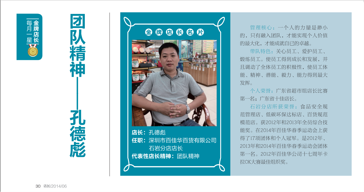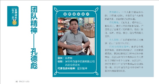 管理核心:一个人的力量是渺小的,只有融入团队,才能实现个人价值的最大化,才能成就自已的卓越。 个人荣誉:广东省超市组店长比赛第一名; 广东省十佳店长。 石岩分店所获荣誉:食品安全规范管理店、低碳环保达标店、百货规范模范店。获2012年和2013年全员综合技能奖。在2014年百佳华春季运动会上获得了17项团体和个人冠军。是2012年、2013年和2014年百佳华春季运动会团体第一名。2012年百佳华公司十七周年卡拉OK大赛最佳组织奖。