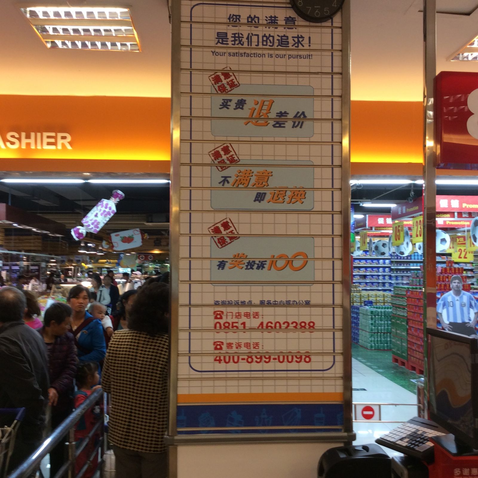 顾客至上的经营理念 合力超市的企业愿景是做“大山走出来的沃尔玛”,在顾客服务理念上确实做到了沃尔玛的标准。这也和李志坚的经营理念相契合。 李志坚加入白云店后调整两个方面:一是商品品类,二是服务标准。不过李志坚说,调整商品品类的最终目的也是为了服务顾客,满足更多消费者的需求。用服务转化为销售,这是李志坚所坚持的。 在商品品类方面,李志坚引进国际化商品和国内知名的一线品牌,要求必须是老百姓耳熟能详,市场认知度高的品牌。同时下架了一批缺乏竞争力的品牌。另外,在商品陈列方面,做到货架的阳面都陈列品牌商品。 在服务标准方面,李志坚要求白云店全体员工每小时要向顾客问候一次,虽然一开始也有员工会不好意思,但执行一段时间后基本上所有人都能自觉遵守。这让顾客感到惊奇的同时,也能让员工产生归属感。 另外,在员工出现失误或执行不到位的情况下,白云店取消了现金处罚,以劳代罚。这个劳就是指要给顾客提供一次小服务,并且用录像拍下来作为执行证据,还要在会议上讲服务感悟。最早执行时,中高层先做起,有了榜样后再推行到基层。久而久之,白云店的员工在服务顾客方面积累了丰富的经验,还能做到自觉服务顾客。到现在,白云店的员工和顾客之间相处地非常融洽,不会有生硬的服务动作和表情。这种人性化的管理,可谓一举数得。 为了更好地服务顾客,白云店还有推出不少服务措施,例如“买贵退差价、不满意即退换、有奖投诉100”、10项免费、10项承诺等。白云店老顾客都知道,在这里即便是吃过、用过、穿过的商品,只要不满意都可以无理由退换。这项措施推出后,李志坚发现,只要商品做得好,退换率还是很小的,每月的退还成本也就万元左右。 另外,顾客如果发现商品损坏、价格高于周边、服务态度不满意等都可以投诉,投诉一次奖励100元。不过白云店不把这个奖励称为“奖励”,而是称为“感谢”。顾客是上帝,哪有奖励上帝的?所以应该是感谢。这是实实在在地把身姿放低。 (图:在收银处的两边都有无购物通道,如果没有采购商品,或有急事想离开商场的可以从这里通过。业内许多超市都还无法做到这点。罩着的四台POS机是快速结算机,只有人流高峰期时才会启动,能有效减少排队的情况。) (图:这是免费饮用水,边上还有其他免费的设施设备,还有休息座椅,如果来往员工看到有顾客坐着休息,就会倒杯水给送过去。)