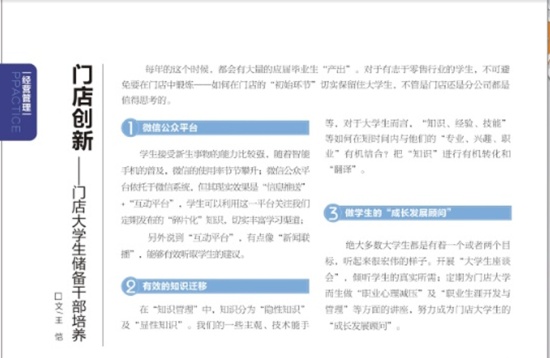 每年的这个时候,都会有大量的应届毕业生“产出”。对于有志于零售行业的学生,不可避免要在门店中锻炼——如何在门店的“初始环节”切实保留住大学生,不管是门店还是分公司都是值得思考的。 1)微信公众平台: 学生接受新生事物的能力比较强,随着智能手机的普及,微信的使用率节节攀升;微信公众平台依托于微信系统,但其现实效果是“信息推送”+“互动平台”,学生可以利用这一平台关注我们定期发布的“碎片化”知识,切实丰富学习渠道; 另外说到“互动平台”,有点像“新闻联播”,能够有效听取学生的建议。 2)有效的知识迁移 在“知识管理”中,知识分为“隐性知识”及“显性知识”。我们的一些主观、技术能手等,对于大学生而言,“知识、经验、技能”等如何在短时间内与他们的“专业、兴趣、职业”有机结合?把“知识”进行有机转化和“翻译”。