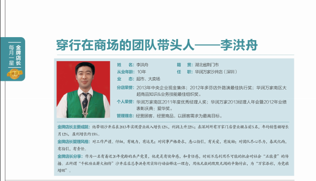 穿行在商场的团队带头人——李洪舟 姓名:李洪舟 从业年龄:10年 业态:超市、大卖场 籍贯:湖北省荆门市 任职:华润万家沙井店(深圳) 分店荣誉: 2013年中央企业现金集体;2012年多芬店外路演最佳执行奖;华润万家南区大超商品知识&业务技能最佳组织奖。 个人荣誉:华润万家南区2011年度优秀经理人奖;华润万家2013经理人年会暨2012年业绩表彰庆典:爱华奖。 管理理念:经营顾客,经营商品,以顾客需求为最高目标。 金牌店长主要成就: 他带领沙井店在2013年实现营业收入增长12%,利润上升22%;在深圳所有万家门店营业额占前5名,年均销售额增长月12%,盈利增长约15%。 金牌店长管理风格:对工作严谨、仔细,有魄力,有远见;对同事严格要求,悉心指引,有关爱,有鼓励;对团队尽心尽力,春风化雨,有指引,有责任。 金牌店长分享: 作为一名有着近20年党龄的共产党员,他更是有使命感,和责任感,时刻不忘利用尽可能的机会对社会“正能量”的传播。正所谓“千秋功业薪火相传”沙井店店总李洪舟用实际行动诠释这一理念,用他无数的默默无闻的辛勤付出,为“万家添彩,为党旗增辉”。 |