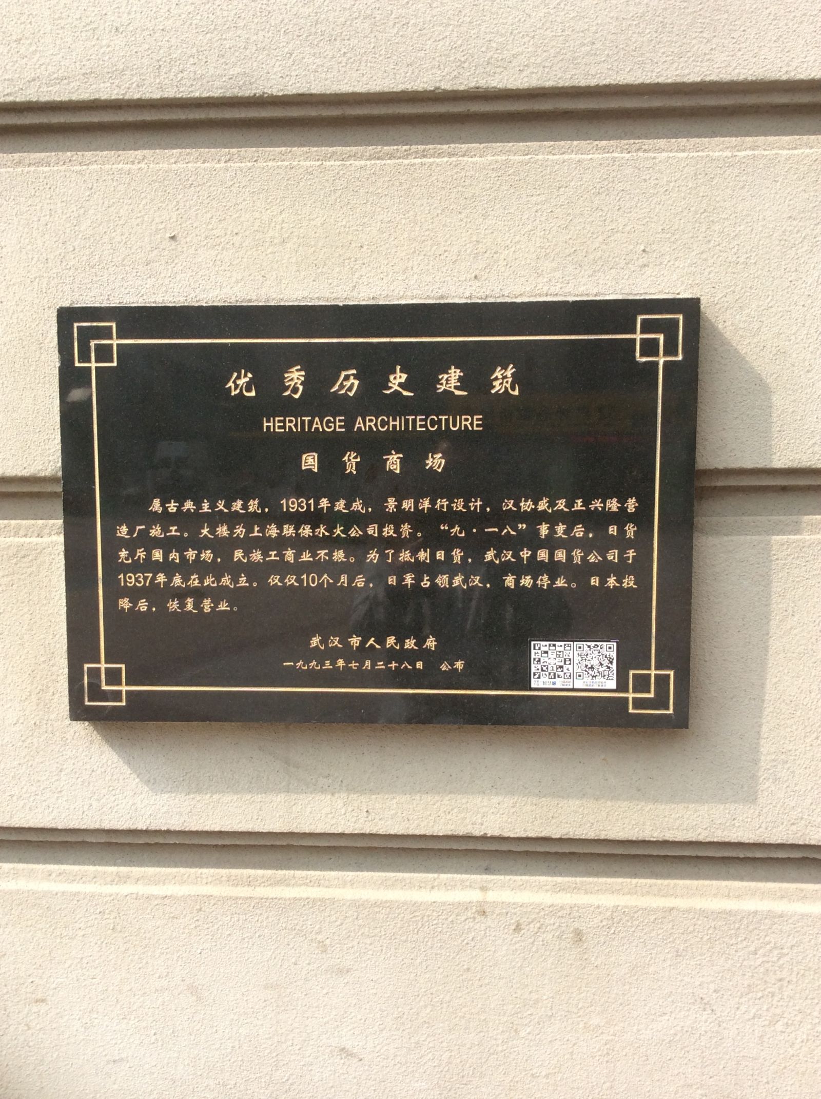 历史的厚重 国货商场始建于1931年,“九·一八”事变之后,为了抵制日货,武汉中国国货公司于1937年在此成立。这便是武汉中心百货大楼的前身,也是武汉中百控股集团的始源地,至今已有83年历史,属于中国最早的一批现代连锁商业,承载并见证了中国近现代零售业的发展与兴旺。 中心百货地处的江汉路步行街。在这里还有其他8幢百年建筑,充满浓郁的人文气息,你能体会到历史厚重的同时,还能领略现代商业的繁荣与兴盛。是大武汉旅游攻略必去之地。