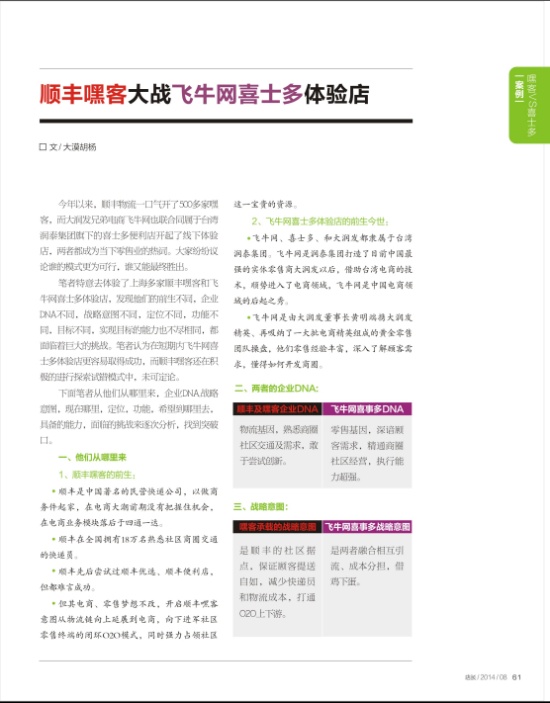 今年以来,顺丰物流一口气开了500多家嘿客,而大润发兄弟电商飞牛网也联合同属于台湾润泰集团旗下的喜士多便利店开起了线下体验店,两者都成为当下零售业的热词。大家纷纷议论谁的模式更为可行,谁又能最终胜出。 笔者特意去体验了上海多家顺丰嘿客和飞牛网喜士多体验店。发现他们的前生不同,企业DNA不同,战略意图不同,定位不同,功能不同,目标不同,实现目标的能力也不尽相同,都面临着巨大的挑战。笔者认为在短期内飞牛网喜士多体验店更容易取得成功,而顺丰嘿客还在积极的探索试错模式中,未可定论。 下面笔者从他们从哪里来,企业DNA,战略意图,现在哪里,定位,功能,希望到哪里去,具备的能力,面临的挑战来逐次分析,找到突破口。 一、他们从哪里来 1.顺丰嘿客的前生: l 顺丰是中国著名的民营快递公司,以做商务件起家,在电商大潮前期没有把握住机会,在电商业务模块落后于四通一达。 l 顺丰在全国拥有18万名熟悉社区商圈交通的快递员。 l 顺丰先后尝试过顺丰优选、顺丰便利店,但都难言成功。 l 但其电商、零售梦想不改,开启顺丰嘿客意图从物流链向上延展到电商,向下进军社区零售终端的闭环O2O模式,同时强力占领社区这一宝贵的资源。 2.飞牛网喜士多体验店的前生今世: l 飞牛网、喜士多和大润发都隶属于台湾润泰集团。飞牛网是继润泰集团打造了目前中国最强的实体零售商大润发以后,借助台湾电商的技术,顺势进入了电商领域,飞牛网是中国电商领域的后起之秀。 l 飞牛网是由大润发董事长黄明端携大润发精英、再吸纳了一大批电商精英组成的黄金零售团队操盘。他们零售经验丰富,深入了解顾客需求,懂得如何开发商圈。