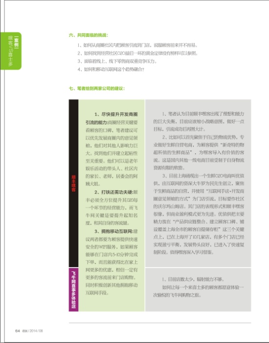 七、 八、笔者给到两家公司的建议: 对于两者: 1.尽快提升开发商圈引流的能力:商圈经营关键要看顾客的口碑,笔者建议可以优先发展商圈内的意见领袖,他们对其他人影响力巨大。找到他们并建立起黏性至关重要。他们可以是老年娱乐活动的带头人、社区内的家长、老师,居委会的阿姨大姐。 2.打铁还需自身硬:顺丰必须全方位提升其020每一个环节的经营能力,而飞牛网关键是要提升起知名度和自身的客流量。 3.拥抱移动互联网:建议两者都要为顾客提供快速安全的WIFI服务,如果顾客能够在门店内5~10分钟完成下单,而且能获得比在家上网更多的优惠,相信一定有更多的客流前来门店购物。同时积极创新其他拥抱移动互联网手段。 对于顺丰嘿客: 1.笔者认为目前顺丰嘿客出现了理想和能力的巨大失衡,应该缩小战略意图,做好一点目标,引流成功后再图大计。 2.可以首先聚焦于自己的物流优势,专业做好生鲜自营电商,为顾客提供“新奇特的物超所值的生鲜商品”,为嘿客导入有价值的客流。这是国内其他一线电商目前受制于自身物流资源有限的软肋。 3.目前,上海涌现出一个生鲜O2O电商叫优值供。由互联网的资深大牛罗为民先生创立,聚焦于生鲜商品的自营。并使用“互联网手法+开发商圈意见领袖的方式”为门店引流,目标要作社区的沃尔玛山姆店。其门店的表现形式和顺丰嘿客很像,但商业盈利模式更为先进。优值供把主要精力放在“产品供应链整合、建立顾客口碑、铺设覆盖上海全市的顾客自提储存柜”这三个关键点上。已在上海开了十几家店,有多个门店已经实现盈亏平衡,发展势头良好,已进入了快速复制阶段。值得嘿客深入学习借鉴。 对于飞牛网喜士多体验店: 1.目前店数太少,辐射能力不够。 2.如何让每一个来喜士多的顾客都愿意体验一次愉悦的飞牛网购物之旅。