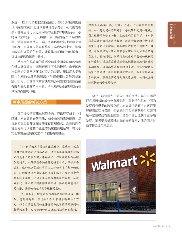 (一)沃尔玛缺乏对具体门店和商品的管理和监督 一般在缺乏供应商动力的情况下,每个沃尔玛的食品采购经理平均要负责三千个左右的单品,纷繁的单品数量使他们难以对具体的门店、商品进行监管。如果没有供应商的支持,采购人员也只能在问题变得非常严重时才会发现。所以,沃尔玛希望由供应商来帮助自己管理单品从而尽可能降低自己的人力成本。大多时候,供应商的销售人员会早于超市的采购人员发现问题,但这需要他们真正地掌握了超市的零售链系统,只有原有的配货中心才能保障自己产品的供应。说到这,沃尔玛公司在中国的运营和管理正是在这个方面遇到了问题。虽然中国国内的供应商很早就已经连接了沃尔玛的零售链系统,但是受限于国内供应商技术方面的落后等因素,使得其不能完全利用零售链系统并作出有效的分析,无法优化自己的产品,并获得更多的利润。因此,多数供应商一开始就不了解这种做法的好处到底在哪里,而只是通过零售链系统接受产品订单,并不是去分析产品的销售情况并做出调整。事实上,零售链系统中的数据供应商没有充分的能力去分析、调整,就导致供应商技术约束使得营销链中的网络优势得不到充分发挥。 (二)没有良性的运营管理,给沃尔玛带来了双方面的损失 这并不能说就一定是供应商拖累了沃尔玛超市的发展,但沃尔玛公司的管理工作确实没有像在国外一样形成良性的运营。由此带来的损失是双方面的。打个比方,当某个高销量的单品在几家门店已经严重缺货,但供应商并没有及时地了解到缺货情况。此时,沃尔玛的采购人员根本没有精力管理每个单品,那这种产品就很可能出现一直在缺货,而无人管理和解决的恶性循环。高销量的产品经常性的缺货,不单单是损失了眼前的利益,更为危险的是可能丧失整个市场,使竞争对手在这过程中发展起来。再比方说,因为某个产品的问题而导致单品的销量太差。此时的供应商如果没有对销售/库存分析数据进行分析,就不能及时洞悉市场对单个商品需求的变化,导致不能及时调整库存,所以就无法建议超市找到相应的替代品来代替目前的商品。基于上述的失误,就会导致大量的库存积压,最后不得不以打折的方式处理。这就造成了多方的利益都受到损失,即将淘汰的产品却成了促销活动的主角,影响了新产品的促销。 (三)沃尔玛灵活高效的物流配送系统与成熟的供应链管理系统在中国遭遇挫折 沃尔玛超市灵活高效的物流配送系统与成熟的供应链管理系统是其取得全球性成功的一个重要原因。它的基本原则是密集建店应围绕一个物流供应链管理,所以当超市达到一定数量时,物流供应链的管理作用能够运用发挥到极致,这无疑确保了在市场上面的价格方面的优势。沃尔玛公司采用的是美国最大的民用系统,即电子信息系统。其POS机(销售时点数据系统)、EDI(电子数据交换系统)、RFID(射频识别技术)等都曾领跑于行业内的其他竞争对手。公司的管理层和各分店均可以运用网络与全世界的供应商在一小时内取得联系,可以将数千家门店的各类产品的库存、销售量完全清点一遍。沃尔玛供应链上面每个节点的部门可以通过信息系统来共享商品的上架、销售与输送和订单的信息等,让整体与零售环节的销售、订货与配送均保持一致性。 然而沃尔玛公司的收到全球多个国家认可的管理和供应链体系在中国却遭到了不小的挫折。由于国内与美国的信息网络环境有很大的差距,所以绝大多数国内供应的信息系统和沃尔玛超市相比更是天差地别。因为,目前国内鲜有沃尔玛公司要求的供应商配有的相应配套的技术平台,所以最终会使得供应商在供货方面出现问题。 库存问题的解决方案 在市场经济高速发展的今天,降低库存成本,可以减少不必要的仓储用地,减少无效的物流配送,是每家零售企业都在探寻的库存管理模式。合理的库存管理方案可以使整个企业的供应链高速运转,有利于实现零售企业供应链各个环节的有机整合。 (1)科学的库存管理方法应该是,零售商-供应商双方有效地实现信息共享,供应商通过直接获得客户信息来自行管理客户库存水平,以及决定库存的增加或减少,以降低整个供应链的供求水平,降低库存成本。这种减少管理环节的方法不但节省了超市的成本,还能促使供应商提高自身服务水平,加速自身资金和物资周转,使供应商和超市都能从中获利。从这点来说,沃尔玛中国做得还不够好,供应商难有相应的权限,并且他们也不具备这样的意识。 (2)现如今,所有的工作都需要用数据说话。比如,有两种商品,在过去三个月中销售额都为六万元,但各自品类利润的差异直接导致了商品所陈列的数量的差异。又比如两种商品虽然同期的利润相同,但因为大小不一样,可能一个是一个小瓶的奶制饮料,一个是大桶的百事可乐,导致他们的周转速度、商品运转周期都不一样。在沃尔玛的倡导下,各个供应商应该高效利用这些数据,通过对数据的分析及时调整自身的销售情况,具备敏锐的信息反馈能力。目前,中国供应商对沃尔玛零售管理系统的应用并不存在技术、能力问题,归根结底就是对零售链的认识还不够透彻。供应商应该通过管理软件合理地利用这些基础数据。沃尔玛作为行业的领导者,应该帮助供应商努力的学习、使用零售链管理系统,加大对培训成本的投入,在供