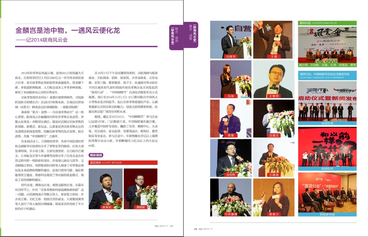 2014年的零售业风起云涌,前有O2O之风刮遍大江南北,后有阿里巴巴上市以3000亿元一举夺得全国首富之壮举。而实体零售业则面临着客流量流失、营业额下滑、多渠道销售瓶颈、人力租金成本上升等多种困境,便有了本届联商风云会的应势而生。 实体零售将何去何从?是要打破思维桎梏,寻找新的创新点和增长点?还是回归零售本质,在商品经营领域一决胜负?抑或是迈出地域限制,一起抱团取暖? 秉承着“联合·造势——为实体零售站台”这一核心思想,联商风云会遍邀国内外知名零售企业高管,齐聚山东青岛·香格里拉酒店,现场对话探讨实体零售的新思路、新模式、新玩法,以借鉴优秀实体零售企业的先进理念和商业思维,挖掘实体零售的先天优势,联合造势,共襄“中国购物节”之盛举。 在本届会议上,可谓精英荟萃。先有中国连锁经营协会副秘书长杨青松分享了零售变革的脉络,后有大润发黄明端、步步高王填、五星电器景星、合力超市汪建文、日本阪急百货今井康博等高管分享了自身企业在经营过程中的一些探索和现状,亦有颂元商业马其华、宝岛眼镜王智民、利群集团狄同伟等人阐述了对零售业现况及未来趋势的理解和建议,还有扫货邦马骏、海信智能商用王建波、费睿科技蒋美兰等对新的商业模式、商业工具的讲解和建议。 时代在变,顾客也在变,商场也跟着在变。在嘉宾对话环节上,针对“实体零售如何创造顾客新体验”这一话题,由联商网庞小伟做主持人,家家悦王培桓、步步高王填、天虹王涛、银座百货孙清龙、大商集团黄伟等人进行了深入地探讨和碰撞,现场来宾均得到了不少好的点子和建议。 在10月17日下午会议即将结束时,由联商网与银泰商业、天虹商场、银座、家家悦、步步高商业、五星电器、宏图三胞、维客集团、孩子王、乐城超市等10家在不同区域具有代表性的国内领先零售企业共同发起的“莲荷行动”、“中国购物节”启动仪式暨发布会正式揭幕,预计在2014年11月11日-16日期间联合中国各大小零售企业共同造节,发出实体零售更强的声音,让顾客重新认识到实体店的魅力,创造全新的顾客体验,拓展实体店更广阔的空间和未来。 据悉,截止至10月24日,“中国购物节”参与企业已达到107家,门店数破万家,中国辐射城市逾百城,几乎覆盖中国所有省份,囊括了百货、购物中心、大卖场、社区超市、家电连锁、母婴用品店、便利店、餐饮娱乐等全业态。参与企业中,年销售额在百亿以上规模的零售企业达13家,年销售额在10亿元以上的企业达68家。 会场花絮 (设计:排版方式参考《店长》5月刊P 22,人物照片每张下面图注人名。) 嘉宾演讲 请按以下人物顺序放照片(照片在2014联商风云会-嘉宾演讲文件夹里) 杨青松、黄明端、马其华、王填、马骏、王智民、景星、汪建文、狄同伟、王建波、今井康博、蒋美兰 嘉宾对话 庞小伟、王培桓、王填、王涛、孙清龙、黄伟 莲荷行动、中国购物节启动仪式暨发布会 启动仪式1 启动仪式2 新闻发布会 花絮 高管夜话 会议现场1 会议现场2 签名墙 晚宴1 晚宴2