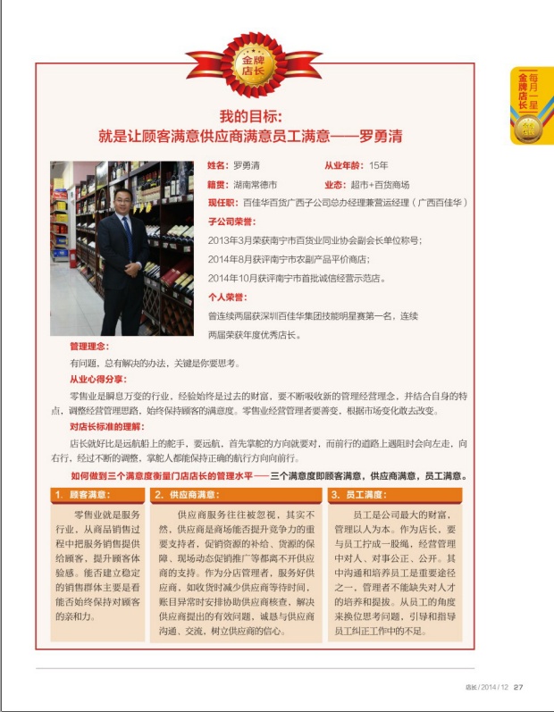 姓名:罗勇清 籍贯:湖南常德市 从业年龄:15年 业态:超市+百货商场 现任职:百佳华百货广西子公司总办经理兼营运经理(广西百佳华) 子公司荣誉:2013年3月荣获南宁市百货业同业协会副会长单位称号;2014年8月获评南宁市农副产品平价商店;2014年10月获评南宁市首批诚信经营示范店。 个人荣誉:曾连续两届获深圳百佳华集团技能明星赛第一名,连续两届荣获年度优秀店长。 团队业绩:广西子公司2014年在门店经营环境大幅受挫情况下(2014年2~3季度门店道路封闭地铁施工),1~3季度利润同比仍增长36.48%,利润指标完成率达395.89%。 管理理念:有问题,总有解决的办法,关键是你要思考。 从业心得分享:零售业是瞬息万变的行业,经验始终是过去的财富,要不断吸收新的管理经营理念,并结合自身的特点,调整经营管理思路,始终保持顾客的满意度。零售业经营管理者要善变,根据市场变化敢去改变。 对店长标准的理解:店长就好比是远航船上的舵手,要远航,首先掌舵的方向就要对,而前行的道路上遇阻时会向左走,向右行,经过不断的调整,掌舵人都能保持正确的航行方向向前行。 如何做到三个满意度衡量门店店长的管理水平 三个满意度即顾客满意,供应商满意,员工满意。 1.顾客满意:零售业就是服务行业,从商品销售过程中把服务销售提供给顾客,提升顾客体验感。能否建立稳定的销售群体主要是看能否始终保持对顾客的亲和力。 2.供应商满意:供应商服务往往被忽视,其实不然,供应商是商场能否提升竞争力的重要支持者,促销资源的补给、货源的保障、现场动态促销推广等都离不开供应商的支持。作为分店管理者,服务好供应商,如收货时减少供应商等待时间,账目异常时安排协助供应商核查,解决供应商提出的有效问题,诚恳与供应商沟通、交流,树立供应商的信心。 3.员工满度:员工是公司最大的财富,管理以人为本。作为店长,要与员工拧成一股绳,经营管理中对人、对事公正、公开。其中沟通和培养员工是重要途径之一,管理者不能缺失对人才的培养和提拔。从员工的角度来换位思考问题,引导和指导员工纠正工作中的不足。