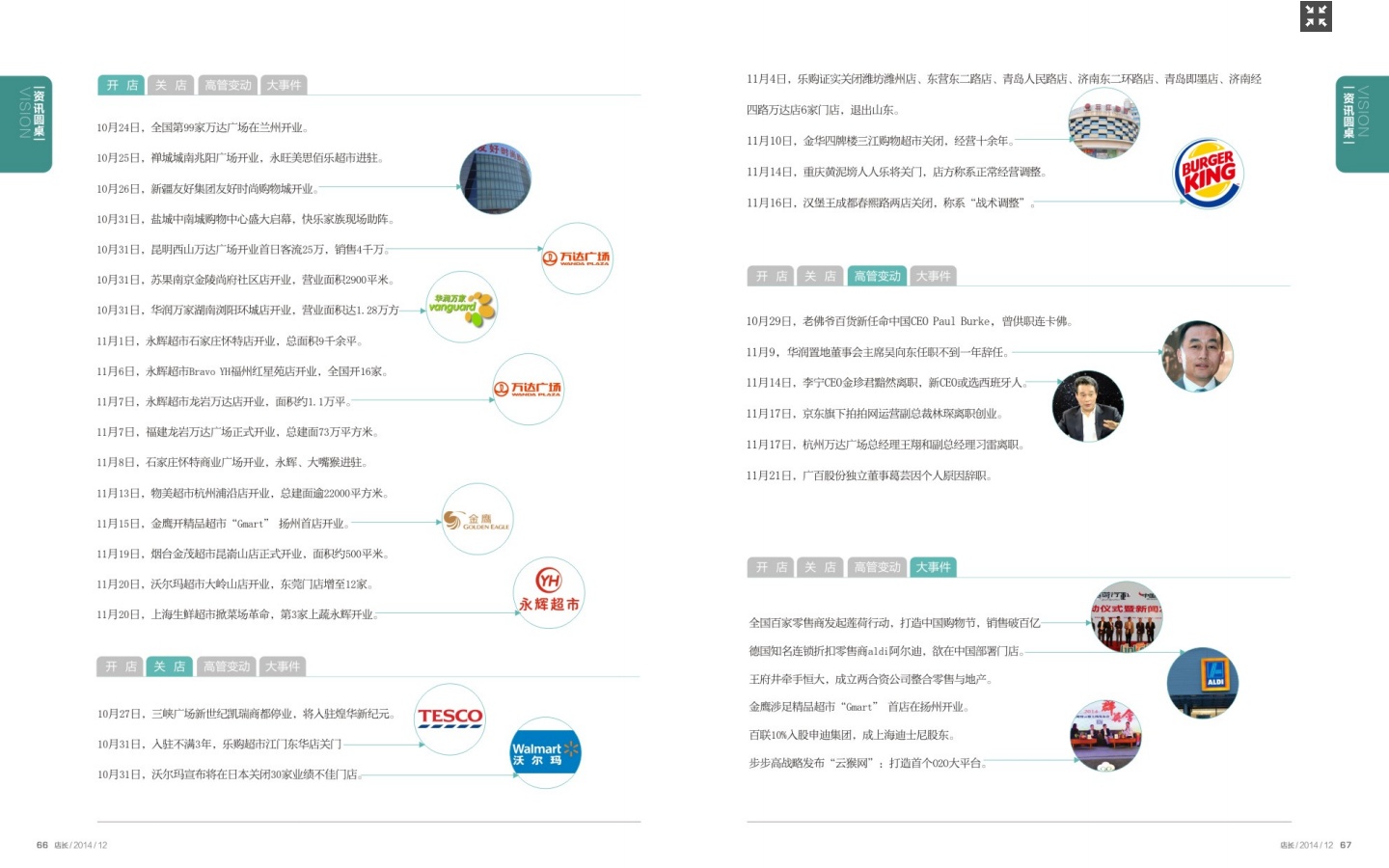 开店 10月24日,全国第99家万达广场在兰州开业。 10月25日,禅城城南兆阳广场开业,永旺美思佰乐超市进驻。 10月26日,新疆友好集团友好时尚购物城开业。 10月31日,盐城中南城购物中心盛大启幕,快乐家族现场助阵。 10月31日,昆明西山万达广场开业首日客流25万,销售4千万。 10月31日,苏果南京金陵尚府社区店开业,营业面积2900平米。 10月31日,华润万家湖南浏阳环城店开业,营业面积达1.28万方 11月1日,永辉超市石家庄怀特店开业,总面积9千余平。 11月6日,永辉超市Bravo YH福州红星苑店开业,全国开16家。 11月7日,永辉超市龙岩万达店开业,面积约1.1万平。 11月7日,福建龙岩万达广场正式开业,总建面73万平方米。 11月8日,石家庄怀特商业广场开业,永辉、大嘴猴进驻。 11月13日,物美超市杭州浦沿店开业,总建面逾22000平方米。 11月15日,金鹰开精品超市“Gmart” 扬州首店开业。 11月19日,烟台金茂超市昆嵛山店正式开业,面积约500平米。 11月20日,沃尔玛超市大岭山店开业,东莞门店增至12家。 11月20日,上海生鲜超市掀菜场革命,第3家上蔬永辉开业。 关店 10月27日,三峡广场新世纪凯瑞商都停业,将入驻煌华新纪元。 10月31日,入驻不满3年,乐购超市江门东华店关门 10月31日,沃尔玛宣布将在日本关闭30家业绩不佳门店。 11月4日,乐购证实关闭潍坊潍州店、东营东二路店、青岛人民路店、济南东二环路店、青岛即墨店、济南经四路万达店6家门店,退出山东。 11月10日,金华四牌楼三江购物超市关闭,经营十余年。 11月14日,重庆黄泥塝人人乐将关门,店方称系正常经营调整。 11月16日,汉堡王成都春熙路两店关闭,称系“战术调整”。 高管变动 10月29日,老佛爷百货新任命中国CEO Paul Burke,曾供职连卡佛。 11月9,华润置地董事会主席吴向东任职不到一年辞任。 11月14日,李宁CEO金珍君黯然离职,新CEO或选西班牙人。 11月17日,京东旗下拍拍网运营副总裁林琛离职创业。 11月17日,杭州万达广场总经理王翔和副总经理习雷离职。 11月21日,广百股份独立董事葛芸因个人原因辞职。 大事件 全国百家零售商发起莲荷行动,打造中国购物节,销售破百亿 德国知名连锁折扣零售商aldi阿尔迪,欲在中国部署门店。 王府井牵手恒大,成立两合资公司整合零售与地产。 金鹰涉足精品超市“Gmart” 首店在扬州开业。 百联10%入股申迪集团,成上海迪士尼股东。 步步高战略发布“云猴网”:打造首个O2O大平台。