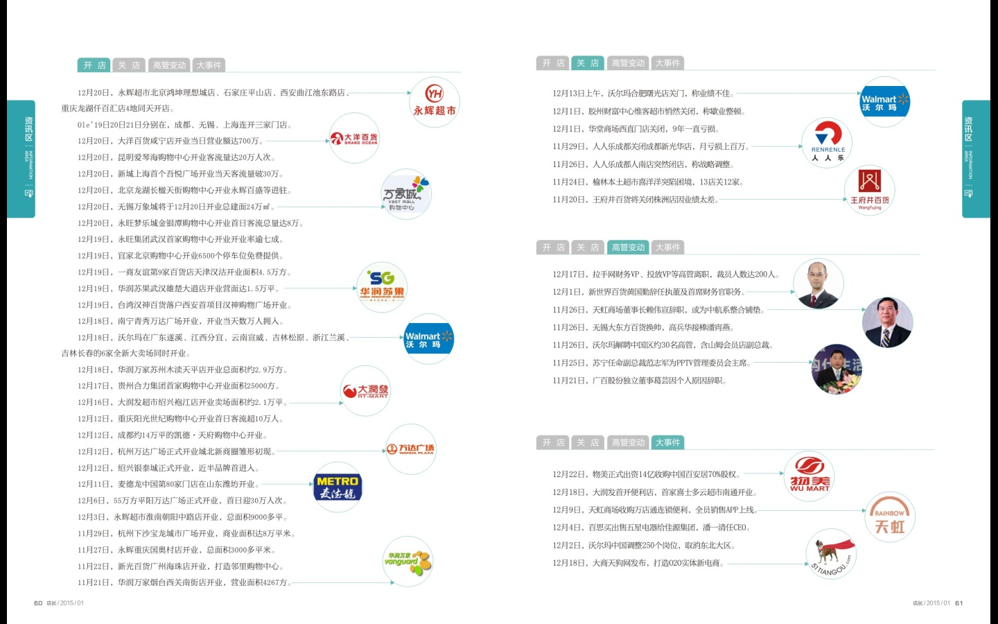 开店 Ole’19日20日21日分别在,成都、无锡、上海连开三家门店。 12月20日,大洋百货咸宁店开业当日营业额达700万。 12月20日,昆明爱琴海购物中心开业客流量达20万人次。 12月20日,新城上海首个吾悦广场开业当天客流量破30万。 12月20日,北京龙湖长楹天街购物中心开业永辉百盛等进驻。 12月20日,无锡万象城将于12月20日开业总建面24万㎡。 12月20日,永旺梦乐城金银潭购物中心开业首日客流总量达8万。 12月19日,永旺集团武汉首家购物中心开业开业率逾七成。 12月19日,宜家北京购物中心开业6500个停车位免费提供。 12月19日,一商友谊第9家百货店天津汉沽开业面积4.5万方。 12月19日,华润苏果武汉雄楚大道店开业营面达1.5万平。 12月19日,台湾汉神百货落户西安首项目汉神购物广场开业。 12月18日,南宁青秀万达广场开业,开业当天数万人拥入。 12月18日,沃尔玛在广东遂溪、江西分宜、云南宣威、吉林松原、浙江兰溪、吉林长春的6家全新大卖场同时开业。 12月18日,华润万家苏州木渎天平店开业总面积约2.9万方。 12月17日,贵州合力集团首家购物中心开业面积25000方。 12月16日,大润发超市绍兴袍江店开业卖场面积约2.1万平。 12月12日,重庆阳光世纪购物中心开业首日客流超10万人。 12月12日,成都约14万平的凯德·天府购物中心开业。 12月12日,杭州万达广场正式开业城北新商圈雏形初现。 12月12日,绍兴银泰城正式开业,近半品牌首进入。 12月11日,麦德龙中国第80家门店在山东潍坊开业。 12月3日,永辉超市淮南朝阳中路店开业,总面积9000多平。 11月27日,永辉重庆国奥村店开业,总面积3000多平米。 11月22日,新光百货广州海珠店开业,打造邻里购物中心。 11月21日,华润万家烟台西关南街店开业,营业面积4267方。 关店 12月13日上午,沃尔玛合肥曙光店关门,称业绩不佳。 12月1日,胶州财富中心维客超市悄然关闭,称歇业整顿。 12月1日,华堂商场西直门店关闭,9年一直亏损。 11月29日,人人乐成都关闭成都新光华店,月亏损上百万。 11月26日,人人乐成都人南店突然闭店,称战略调整。 11月24日,榆林本土超市喜洋洋突陷困境,13店关12家。 高管变动 12月17日,拉手网财务VP、投放VP等高管离职,裁员人数达200人。 12月1日,新世界百货黄国勤辞任执董及首席财务官职务。 11月26日,天虹商场董事长赖伟宣辞职,或为中航系整合铺垫。 11月26日,无锡大东方百货换帅,高兵华接棒潘宵燕。 11月26日,沃尔玛解聘中国区约30名高管,含山姆会员店副总裁。 11月25日,苏宁任命副总裁范志军为PPTV管理委员会主席。 大事记 12月22日,物美正式出资14亿收购中国百安居70%股权。 12月9日,天虹商场收购万店通连锁便利,全员销售APP上线。 12月4日,百思买出售五星电器给佳源集团,潘一清任CEO。 12月2日,沃尔玛中国调整250个岗位,取消东北大区。 12月18日,大商天狗网发布,打造O2O实体新电商。