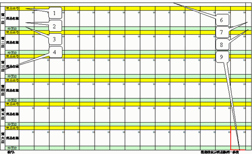 1——用于输入商品编号; 2——显示商品名称,可通过VLOOKUP函数实现; 3——记录某个商品的排面数; 4——根据部门货架层数确定,如部门里货架层数最多为六层,就设为六层; 5——一般商场的货架都是有统一的编号的,用于标位; 6——用于输入一些提示的信息,比如表格中总体排面的说明; 7——记录一层中,商品陈列品种数,可通过COUNT函数实现; 8——记录一层中,商品陈列排面数总和,可通过SUM函数实现; 9——垂直标注“L”线,用于垂直标注。