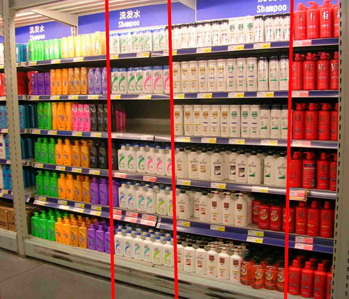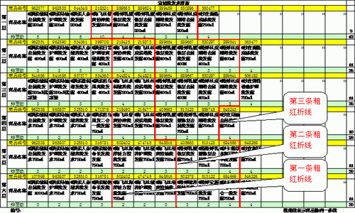 (三) 垂直标注说明(图中粗红折线说明) 在商品陈列中,有一个很重要的陈列原则就是垂直陈列。表格中的垂直标注是为了将商实际垂直陈列与商品排面表格对应起来。以上图中最右边的粗红折线(第三条粗红折线)为例,这条粗红折线表示在该粗红折线二侧的商品是处在一条垂直线的二侧。上图中有三条粗红折线,表示实际的商品陈列中,有三处是垂直到底的。按照上面的表格,实际的陈列如下图如示。  上图中最右边的粗红线(第三条粗线垂直线)就是对应上表中的第三条粗红折线。有了垂直标注,便于排面的维护。为提高在表格中画折线的效率,是通过拉伸垂直标注“L”线实现的。