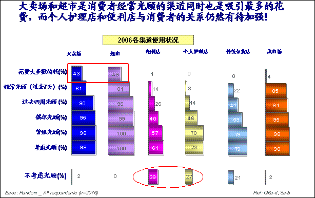 当前中国零售市场的总趋势 ◇ 现代通路还在持续发展,虽然在某些城市已经达到了饱和的状态,但总体而言可发展的余地和空间还是很大的 ◇ 国际零售商和本土零售商;大卖场和超市之间争夺购物者的竞争日趋激烈 ◇ 传统渠道已经走下坡路,但对于供应商而言尚有潜力可挖 ◇ 菜市场的购物频率居高不下,给零售商带来“新鲜”启示 ◇ 中国购物者是亚洲购物频率最高的购物群体之一 ◇ 频繁的购物率给零售商和供应商带来了 ● 频繁的补充购物 ● 打折的追寻者 ● 门店忠诚度低 ● 缺货给供应商带来了挑战-购物者会在极短的时间内选择其它品牌 ● 光顾店面选择的原因已经不是便利为主了,最主要的因素是 ● 品种繁多 ● 服务 ● 新鲜的食品 ◇ 由于中国现代通路的逐渐成熟,购物者的期望值越来越高。零售商和供应商在供应链的效率、店内实施和品牌及品类的开发面对着共同的挑战。了解中国购物者的心态和行为是赢得竞争的唯一途径。