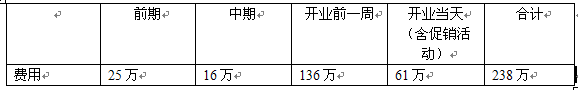 中期费用总计:16万 开业前一周(12月10日—12月17日) 开业迫在眉睫,一切工作正在紧张有续的进行着。购物中心的模式和格局已基本呈现,包括店内的装潢即将完成、商品到位、招商区的装修、外立面的完善、广告位的到位等。一个现代的、温州市最大的购物中心呈现在市民的面前。所以,我们必须从购物中心的规模、商品的丰富、服务的优良、优美舒适的购物环境等方面在广大市民心中树立起良好的口碑。 报刊: 时间:10、13、17 《温州商报》、《温州晚报》,以通栏的形式同时发表题为《12月18日隆重开业》等开业消息。并夹带着诱人的开业促销活动; 《温州都市报》,整版的开业消息公告,题为《12月18日隆重开业》,同时公布部分开业特价商品和促销活动。 广播:经济台、交通台 时间:10日—17日(全天滚动播出) 在黄金时段每天反复播出题为《12月18日隆重开业》报道,内容主要为规模、商品、服务、功能等方面。 电视:省台、有线电视 在黄金时段每天反复播出题为《12月18日隆重开业》报道,内容主要为规模、商品、服务、功能等方面。摄影师拍摄部分购物中心场景并加以相应的介绍。采访项目总监王云华先生,介绍山姆士大世界。 车体广告 时间:11月1日开始 在温州公交集团下属市区的所有公交车上做车身两侧的车体开业广告,题为《12月18日隆重开业》,联系公交集团在附近开设几个停车站点。 过街条幅:在温州市区主要十字路口挂上过街条幅,内容为“山姆士大世界12月18日隆重开业”,数量约30条。 巨幅布幔:在建筑物外墙挂上巨幅布幔,内容为“山姆士大世界12月18日隆重开业”,尺寸:12米×2米 店内氛围:用开业海报、气球、红灯笼来装饰布置卖场氛围。 DM邮报:根据鹿城区人口数量统计为875006,建议开业期间的DM邮报数为25万左右,规格为大8开、24P、纸张为64克轻涂纸。请专业投递公司在开业前3天投递28万份到温州市区的每个社区和街道。并留2万份在开业期间放在服务中心发放。 费用总计:1361000元