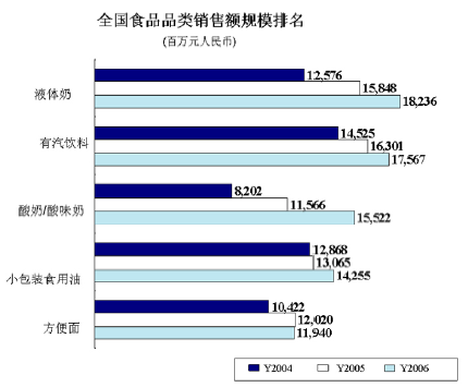 液体奶市场变化特征 根据2007年尼尔森《放眼中国市场》的报告,液体奶的销售在过去几年中一直处于上升趋势:虽然2006年的增长率有所放缓,但15个百分点的增长率还是让液体奶荣登尼尔森所监测的食品类2006年销售额排行榜冠军的宝座。2006年液态奶的销售额达到18亿元,居尼尔森监测范围内食品品类之首。