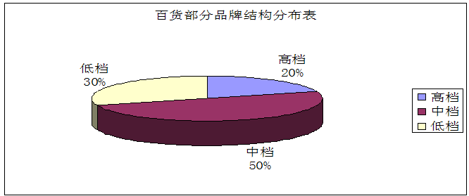 2.价格带分布 超市部分:(略) 百货部分:价格带分布在50元至200元以内。 品牌层次结构如下图: